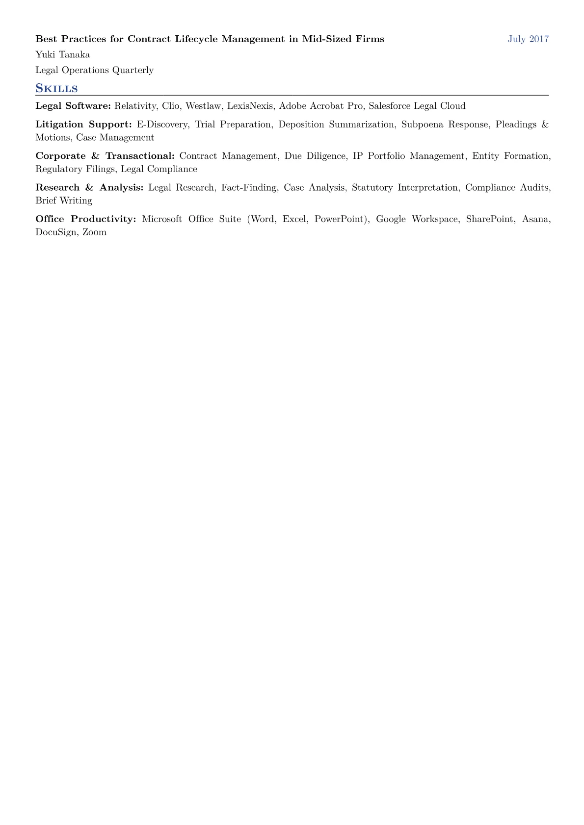 The JobSprout Senior Paralegal example effectively showcases these critical elements. It excels by presenting accomplishments with quantifiable results, for instance, detailing the management of discovery for multiple intricate cases that led to successful resolutions, or drafting and reviewing a significant volume of contracts with zero compliance breaches. Technical and soft skills are strategically grouped, separating litigation support from corporate compliance or legal technology proficiency. Furthermore, industry-standard tools like Relativity or Westlaw are prominently listed, demonstrating practical expertise crucial for a senior role.