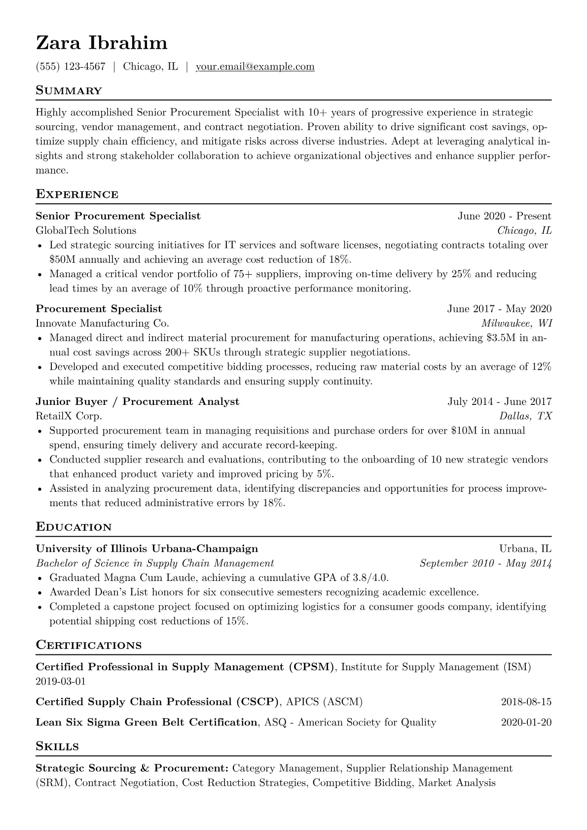 The example resume effectively demonstrates these qualities through its thoughtful structure. It quantifies achievements with specific percentages and dollar figures, such as "negotiated 15% annual savings on critical components" or "managed $10M+ spend portfolio." Skills are strategically grouped into distinct categories like "Strategic Sourcing & Negotiation," "Contract Management," and "Supplier Relationship Management," making them highly scannable for recruiters. Crucially, it highlights relevant procurement software proficiencies and any industry certifications prominently, signaling expertise directly applicable to complex procurement environments.