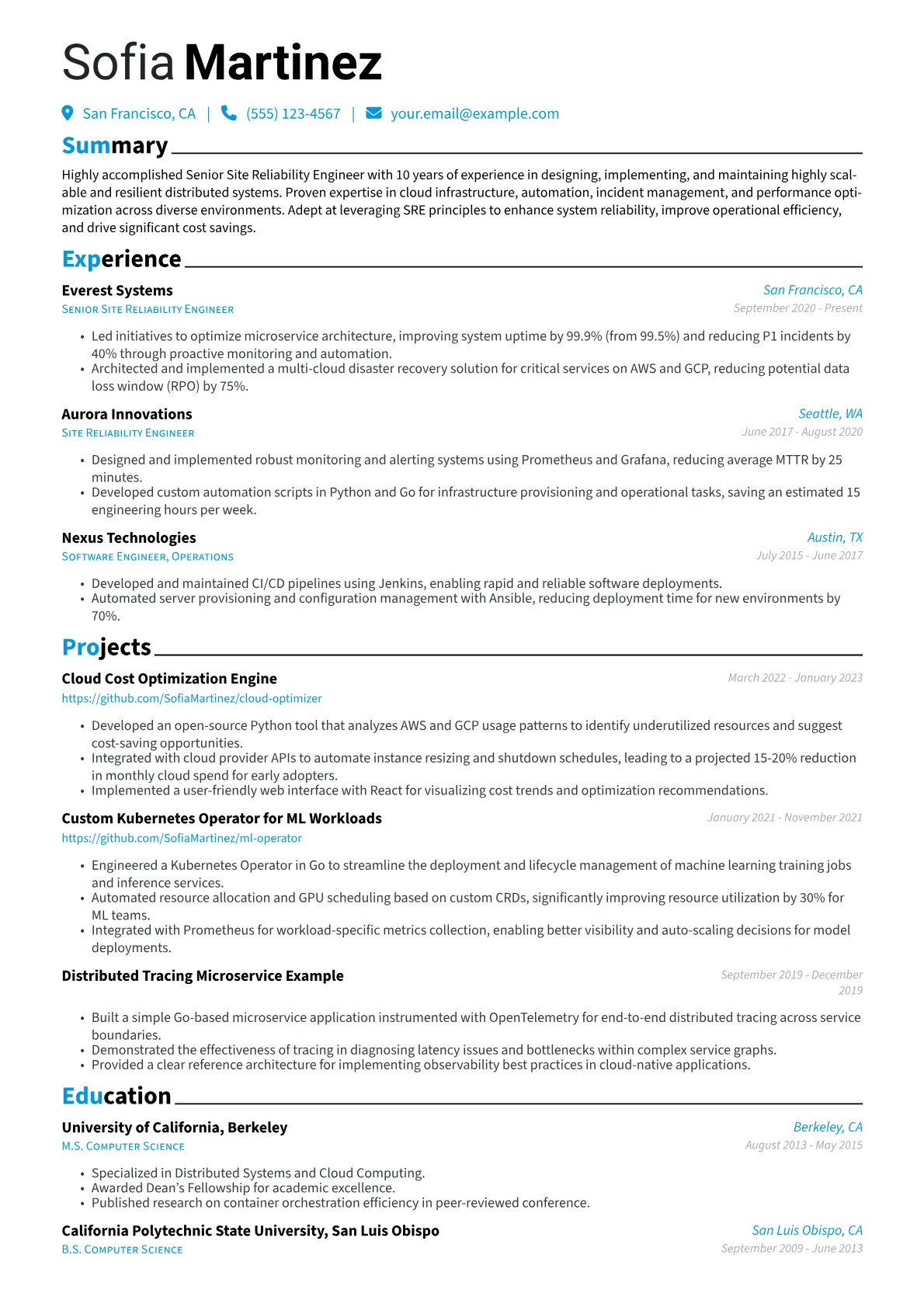This template was built with JobSprout and can be remixed to create your own tailored Senior Site Reliability Engineer resume.