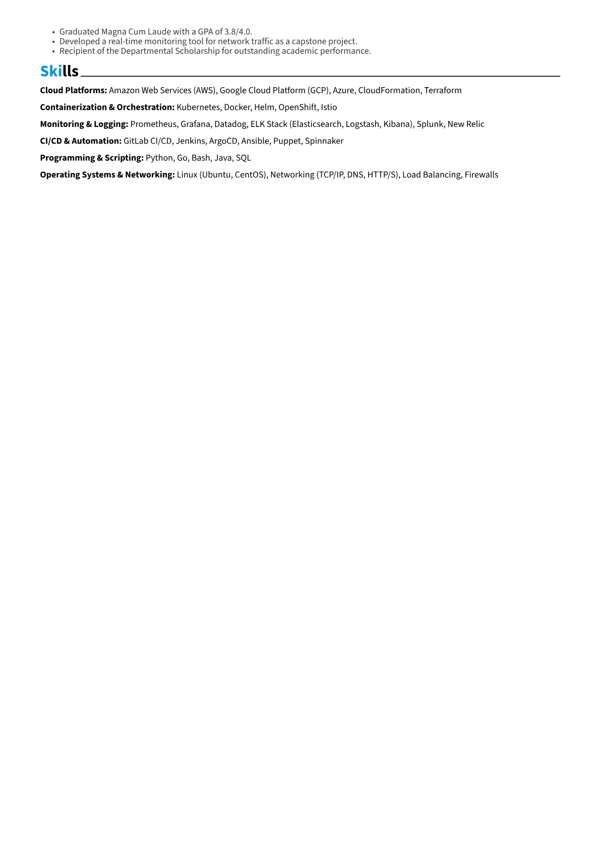 The JobSprout SRE resume example effectively structures these critical details. Achievements are quantified, illustrating concrete results such as "Automated deployment pipelines, decreasing release cycles by 40%." Technical skills are clearly grouped by domain, separating "Cloud Platforms" (AWS, Azure) from "Containerization" (Kubernetes, Docker) and "Observability" (Grafana, Splunk). This organization allows hiring managers to quickly identify core competencies. Key tools and programming languages like Python and Go are prominently featured, alongside certifications crucial for the role.