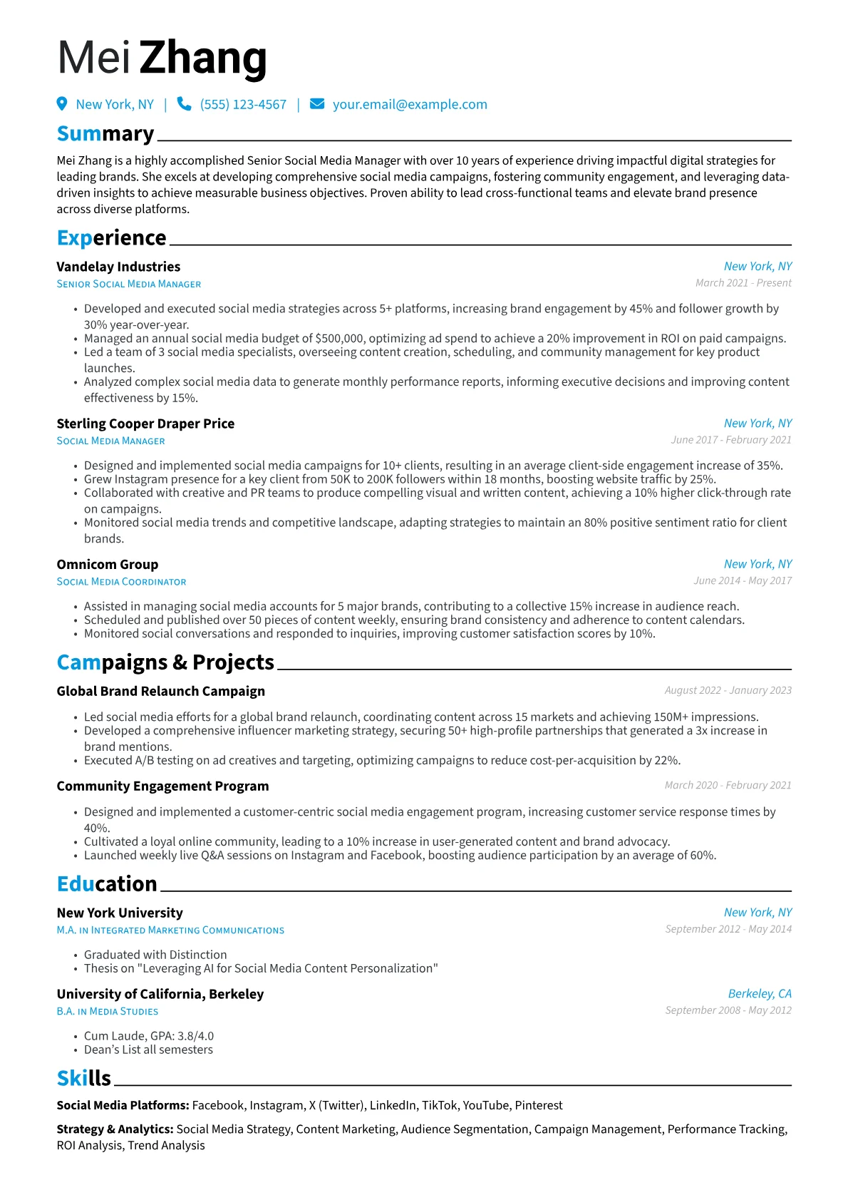 This example excels at highlighting such senior-level expertise effectively. Achievements are rigorously quantified, detailing specific percentage increases in engagement or successful budget management for multi-million dollar campaigns. Skills are strategically grouped into areas like "Social Strategy & Leadership," "Platform Management," and "Analytics & Reporting," making advanced proficiencies in tools such as Sprinklr or Sprout Social immediately apparent. Explicit mention of leading cross-functional teams and implementing data-driven content strategies effectively communicates senior impact.