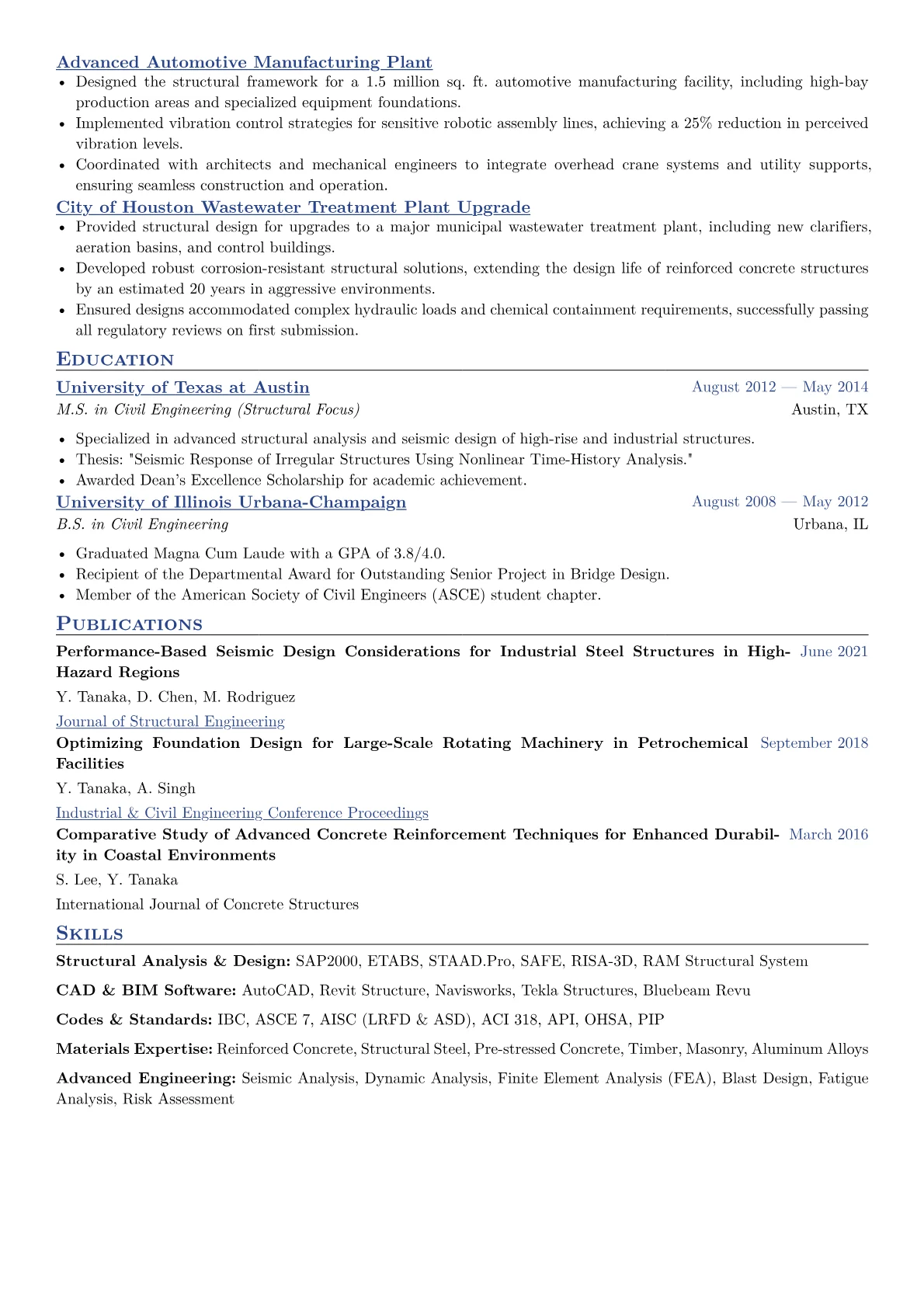 For a Senior Structural Engineer in Manufacturing, an effective resume spotlights not just design capabilities but also their application within complex industrial environments. Hiring managers seek candidates with extensive experience in critical structural analysis for heavy machinery foundations, specialized process equipment supports, and facility modifications. Key achievements should quantify contributions to operational efficiency or safety, such as optimizing structural designs to reduce material costs or ensuring code compliance (e.g., ASCE 7, AISC) for critical plant infrastructure. A Professional Engineer (PE) license is often non-negotiable, alongside proficiency in industry-standard software like STAAD.Pro, SAP2000, or ETABS for structural modeling and analysis.