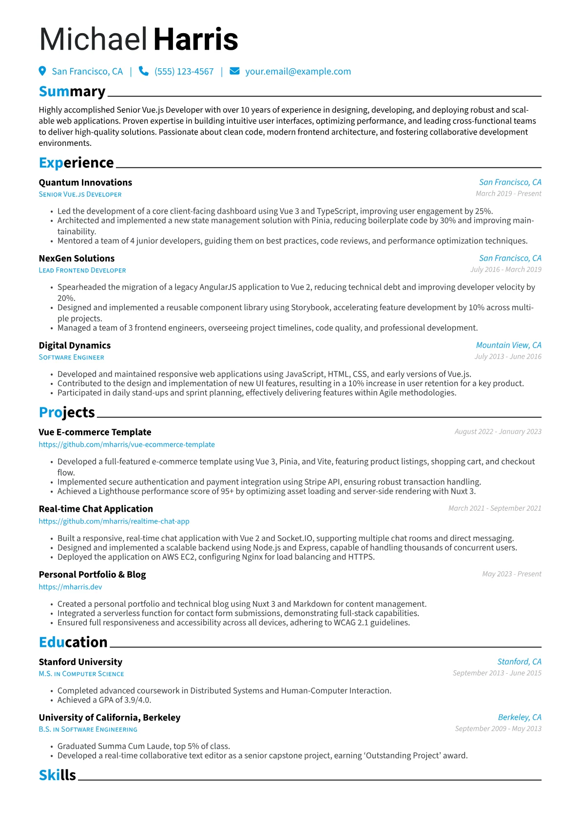 This example resume effectively showcases these senior-level attributes. Quantified achievements are prominently featured, detailing measurable outcomes like specific improvements in application load times or reductions in code complexity. Skills are thoughtfully grouped, distinguishing core Vue.js ecosystem proficiencies from broader frontend technologies and integration tools. The layout gives appropriate weight to leadership responsibilities within development cycles and strategic problem-solving, aligning with the expectations for an experienced professional.