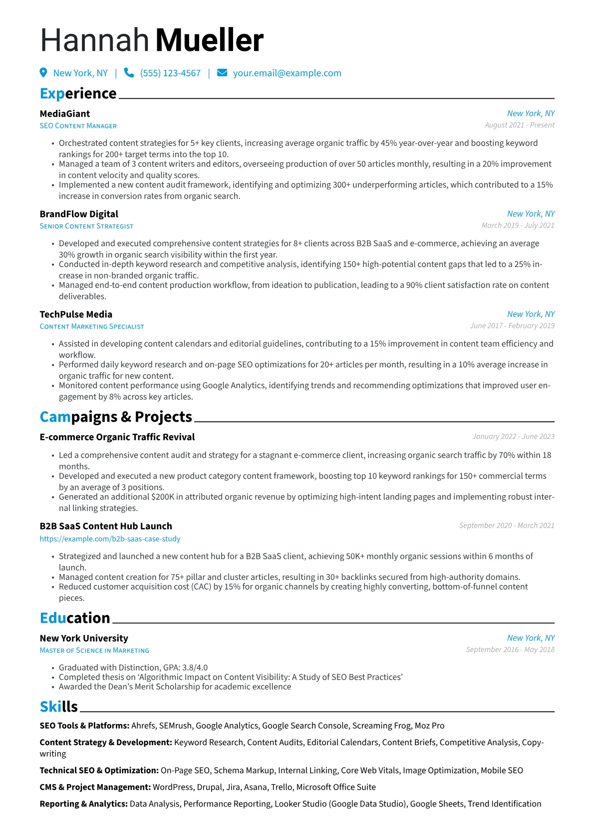 A standout SEO Content Manager resume in Marketing & Advertising clearly demonstrates a candidate's ability to drive measurable organic growth. Hiring managers seek evidence of successful content strategies that boost traffic, improve rankings, and convert users, often looking for a keen understanding of algorithm updates and audience intent. The unique challenge lies in showcasing both creative content leadership and deep technical SEO proficiency.