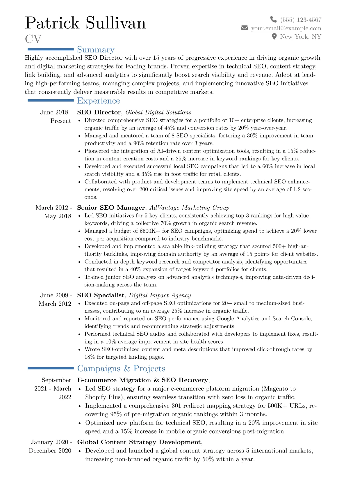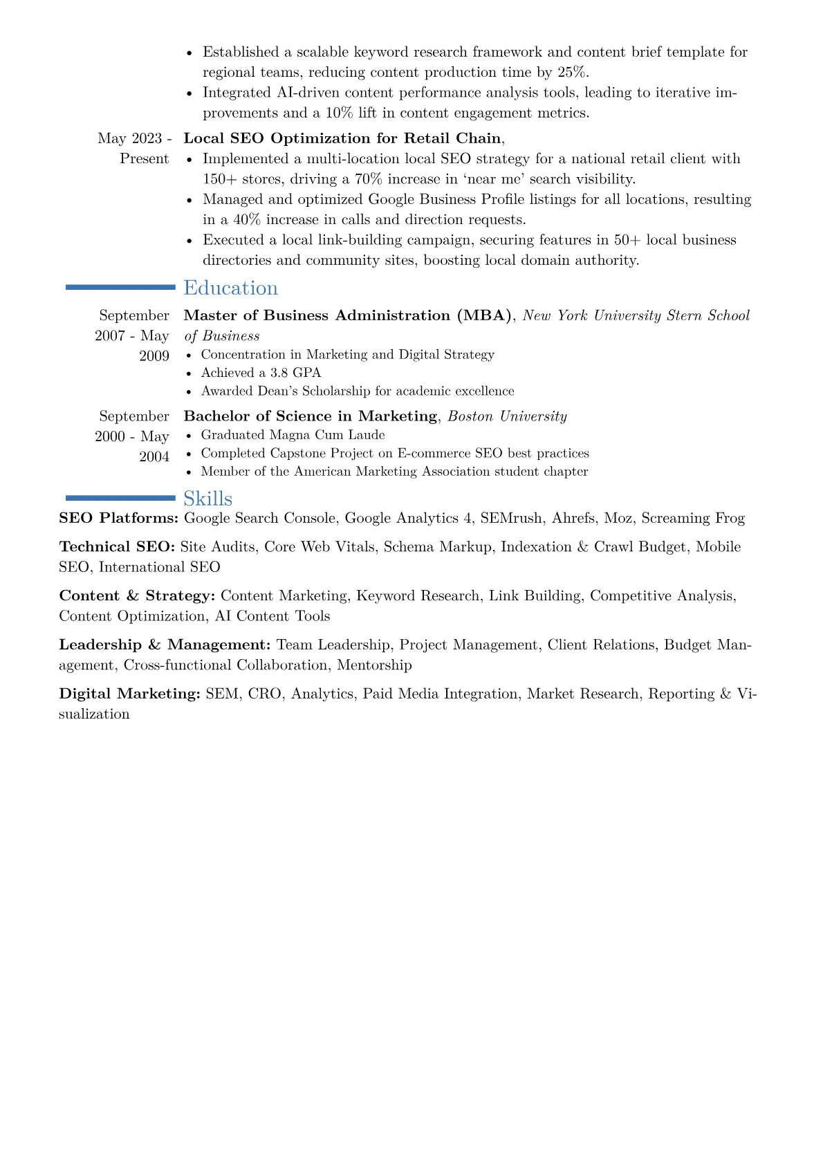 This example CV excels by clearly quantifying leadership achievements upfront, demonstrating strategic influence. Key metrics like "increased organic search revenue by 45%" or "drove 300% improvement in critical keyword rankings" provide immediate impact. Skills are logically grouped, separating areas like Technical SEO from Content Strategy & Team Leadership, while prominently featuring proficiency in essential tools such as Ahrefs, Google Search Console, and Screaming Frog. This structured approach highlights the director's ability to operate at both strategic and technical levels, managing large teams and complex projects within competitive markets.