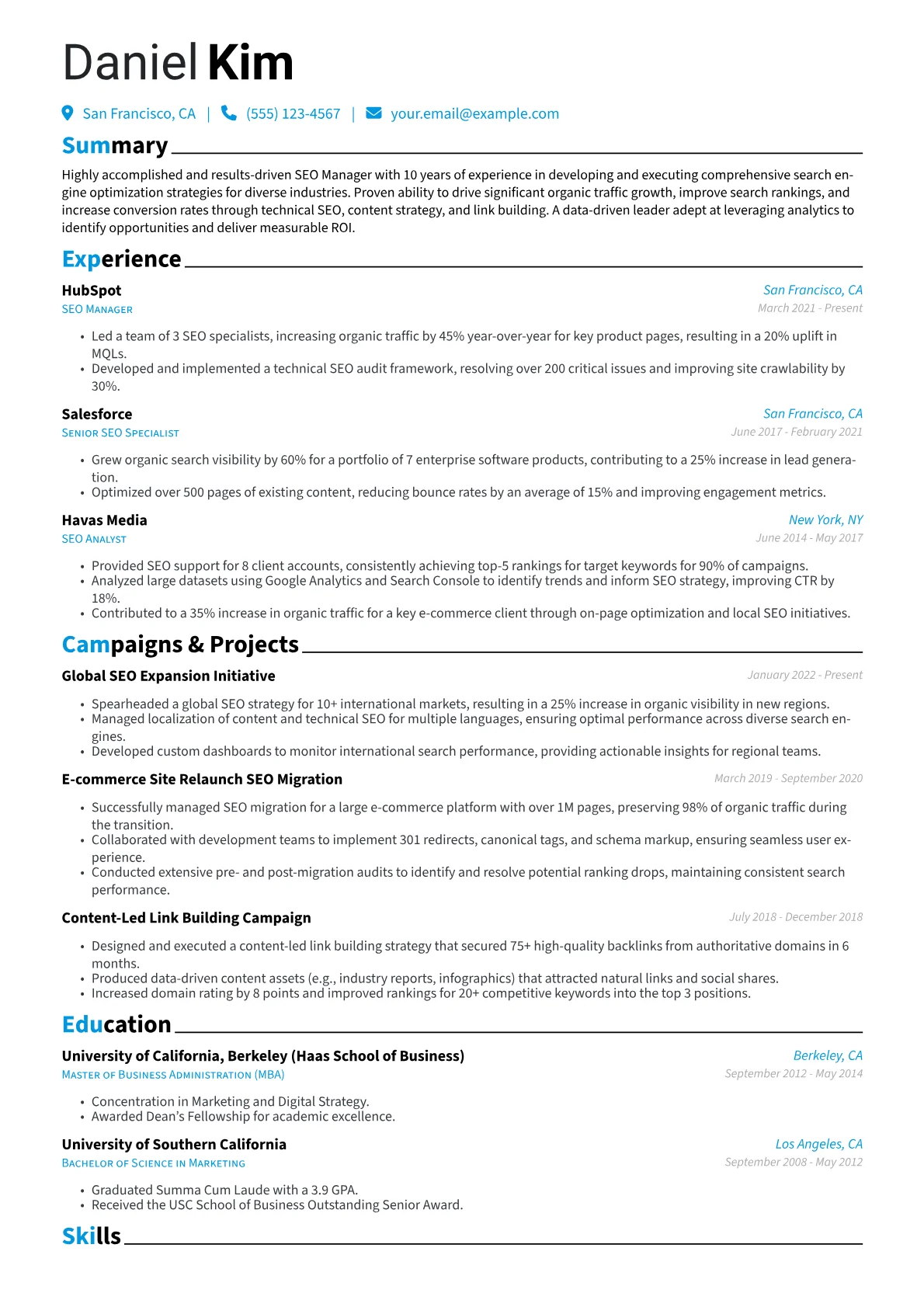 The JobSprout SEO Manager resume example excels by showcasing these critical elements effectively. It strategically quantifies achievements, for instance, by stating "orchestrated content strategy resulting in a 75% rise in non-branded organic traffic" rather than just "managed content." Skills are thoughtfully grouped into categories like "Technical SEO," "Content & Strategy," and "Analytics & Reporting," providing immediate clarity on the candidate's diverse expertise. Important certifications and industry-standard tools are prominently featured, assuring recruiters of a candidate's readiness to tackle complex SEO challenges.