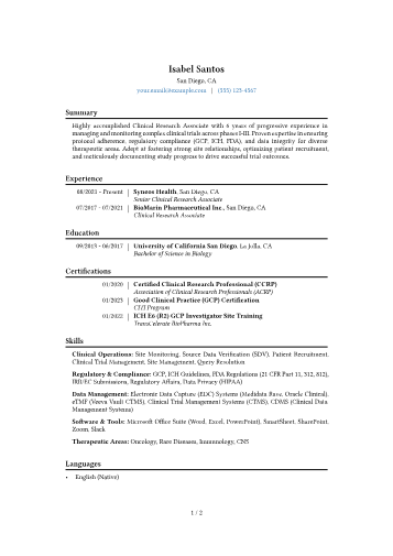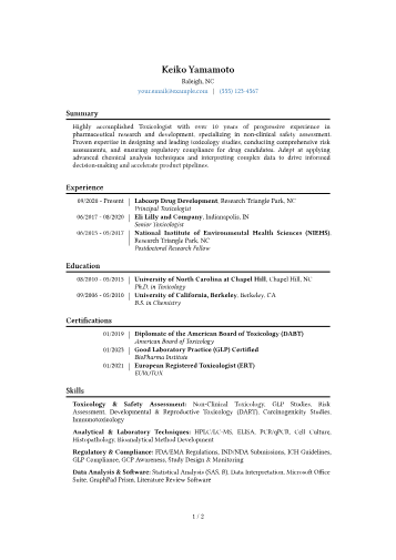 Her bullet points are specific. "Facilitated technical due diligence and negotiations... resulting in an $861M deal" is concrete and memorable. The skills section lists actual techniques: Western blot, ddPCR, confocal microscopy. No vague "laboratory proficiency" claims.