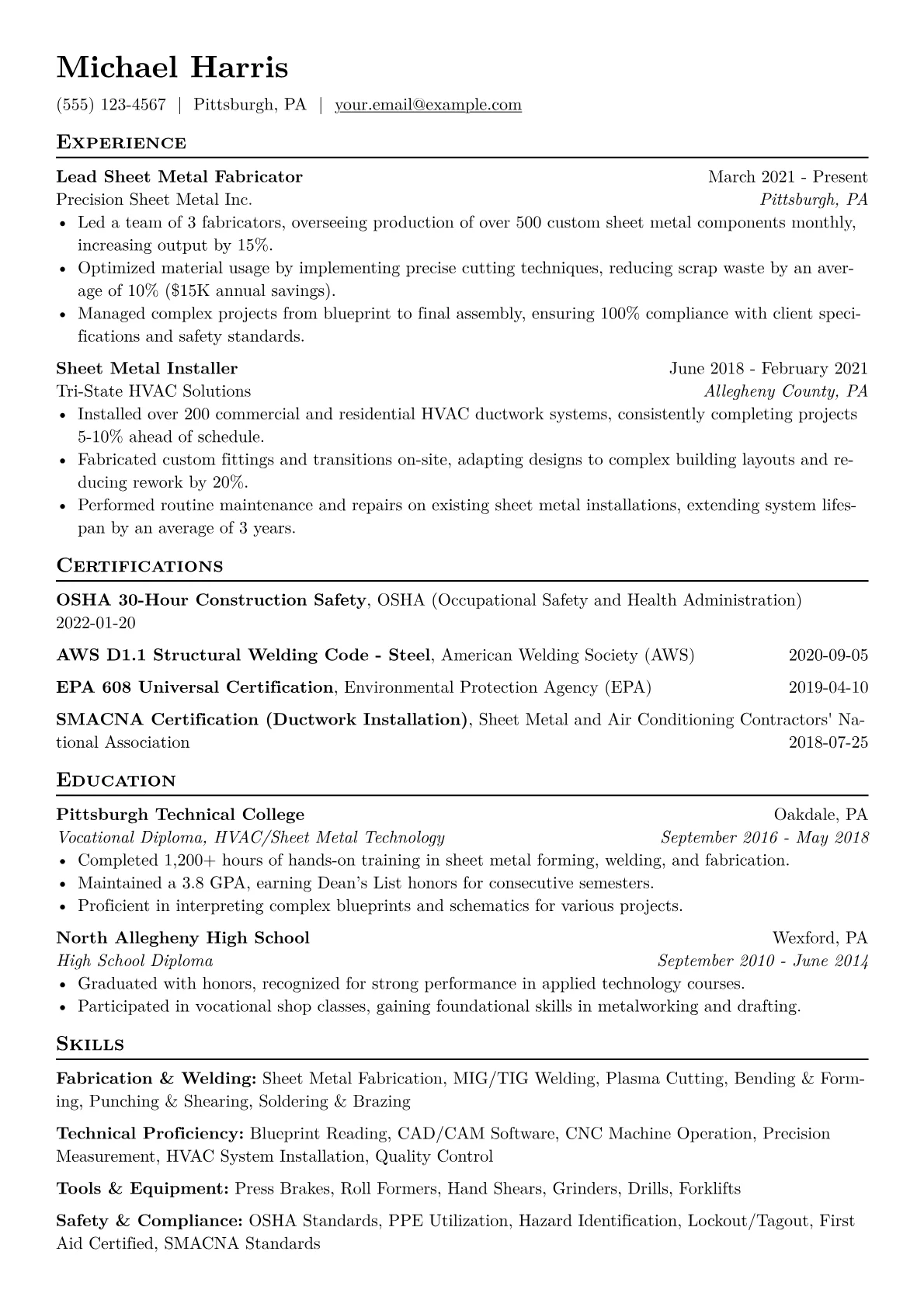 This example effectively addresses these points by strategically grouping relevant technical skills, certifications like OSHA 10, and specific welding proficiencies. It particularly shines in presenting quantified achievements, such as "reduced material waste by 10%" or "completed projects 15% ahead of schedule," which clearly illustrate a direct impact.