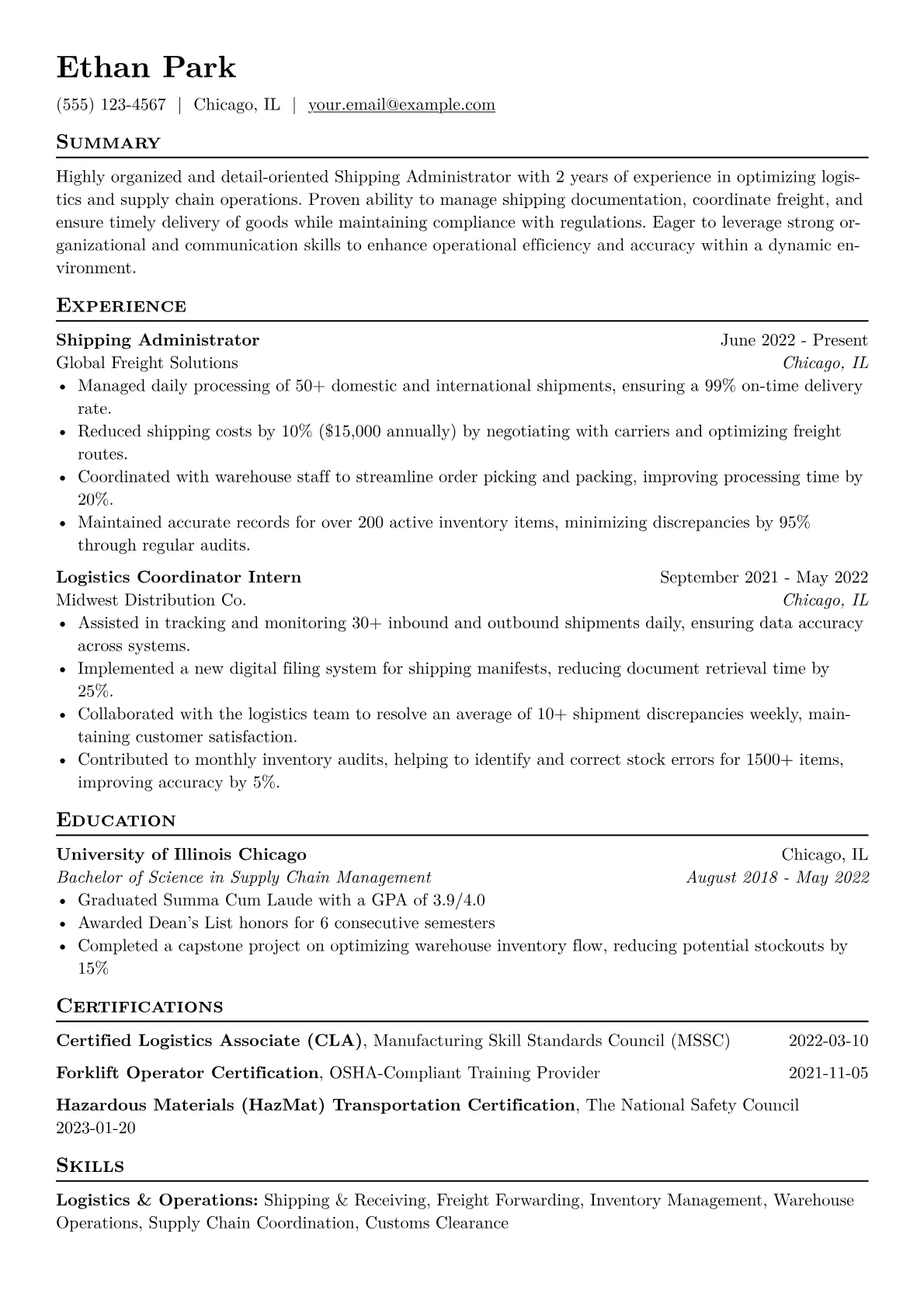 This example resume excels at presenting these necessary skills and experiences. It quantifies achievements by stating the volume of shipments handled daily or the accuracy rate maintained, rather than broad statements. Skills are clearly grouped to feature proficiency in logistics software like WMS or ERP systems, alongside essential communication and data entry capabilities. Crucially, any relevant certifications or specific tools used, such as particular inventory management platforms or customs software, are distinctly highlighted, giving a clear picture of the candidate's practical abilities.
