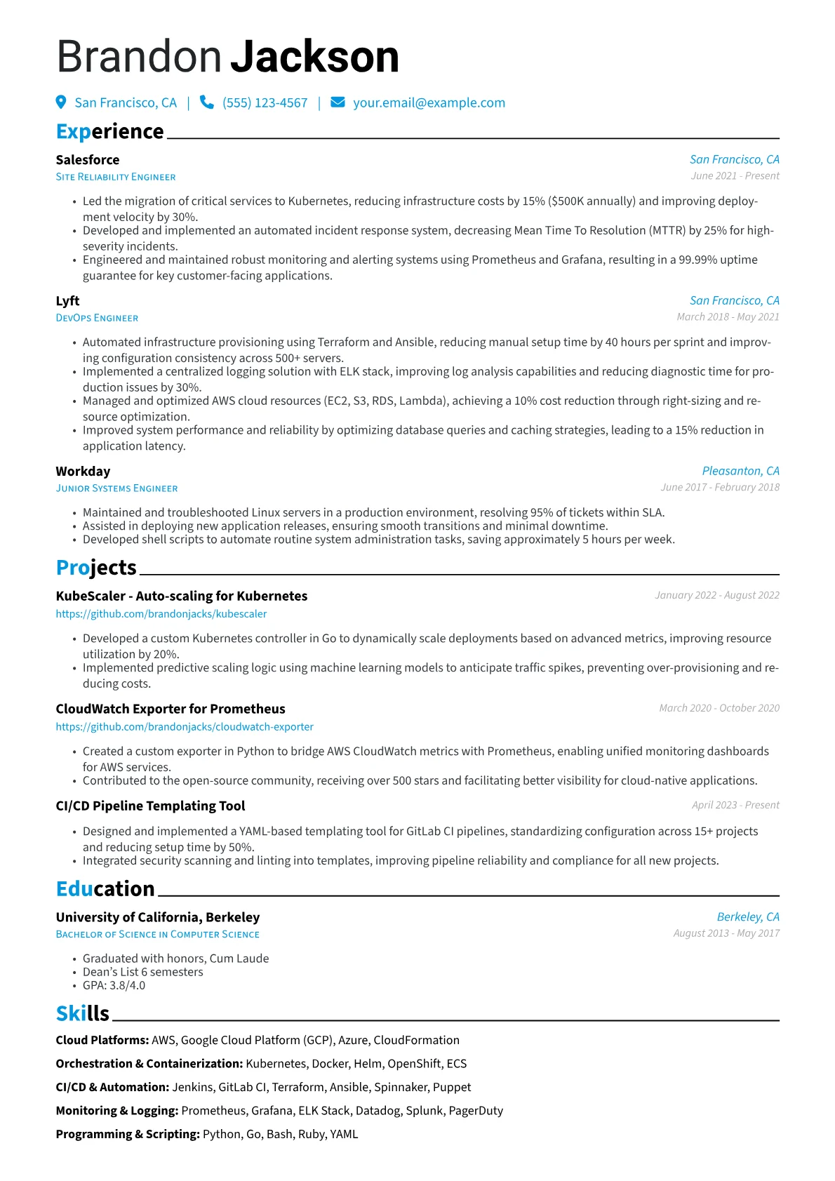 This JobSprout example excels by prominently featuring quantified achievements, immediately illustrating the candidate's tangible contributions to reliability improvements and cost savings. Its well-structured skills section clearly delineates proficiency in cloud platforms, monitoring tools, and programming languages essential for SRE roles. The inclusion of relevant certifications further solidifies the candidate's specialized expertise.