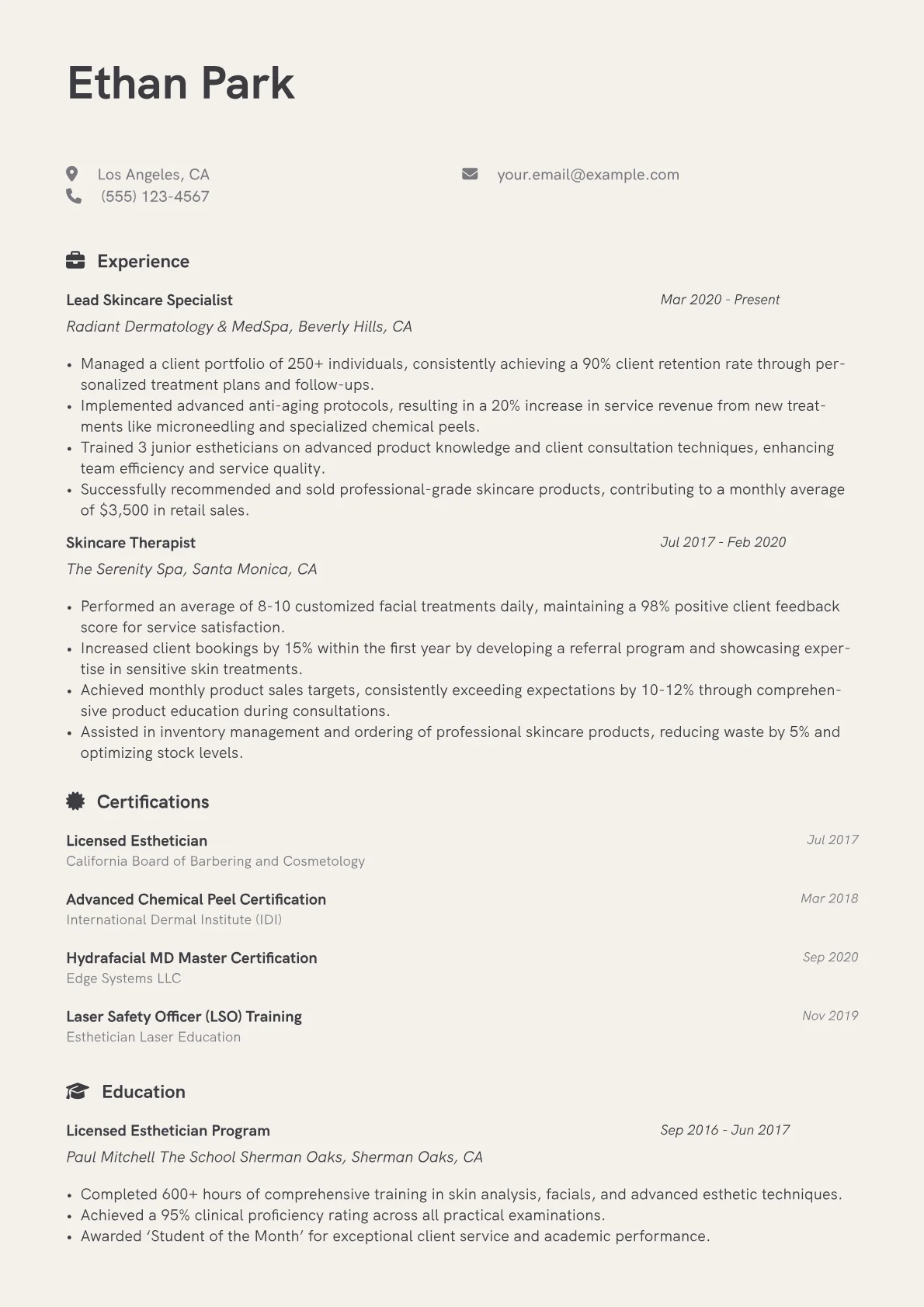 This example resume excels by prioritizing quantifiable achievements, such as increasing product sales or client retention, to demonstrate clear impact. It strategically groups relevant certifications and specialized skills, like advanced treatment modalities or specific product line expertise, making a candidate's core competencies immediately apparent. The use of strong action verbs throughout the experience section further highlights an applicant's proactive and results-oriented approach.