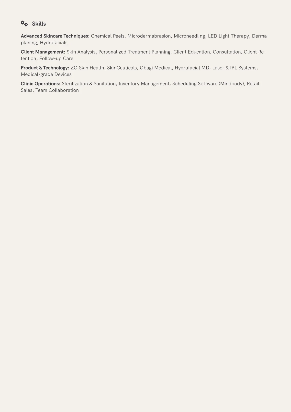A strong Skincare Specialist resume effectively blends aesthetic expertise with tangible business contributions. Hiring managers in diverse professional settings look for candidates who not only excel at client consultation and treatment delivery, but also demonstrate strong product knowledge, sales acumen, and a commitment to professional development. A unique challenge for specialists is showcasing how their skills directly contribute to business growth and client satisfaction beyond basic service provision.