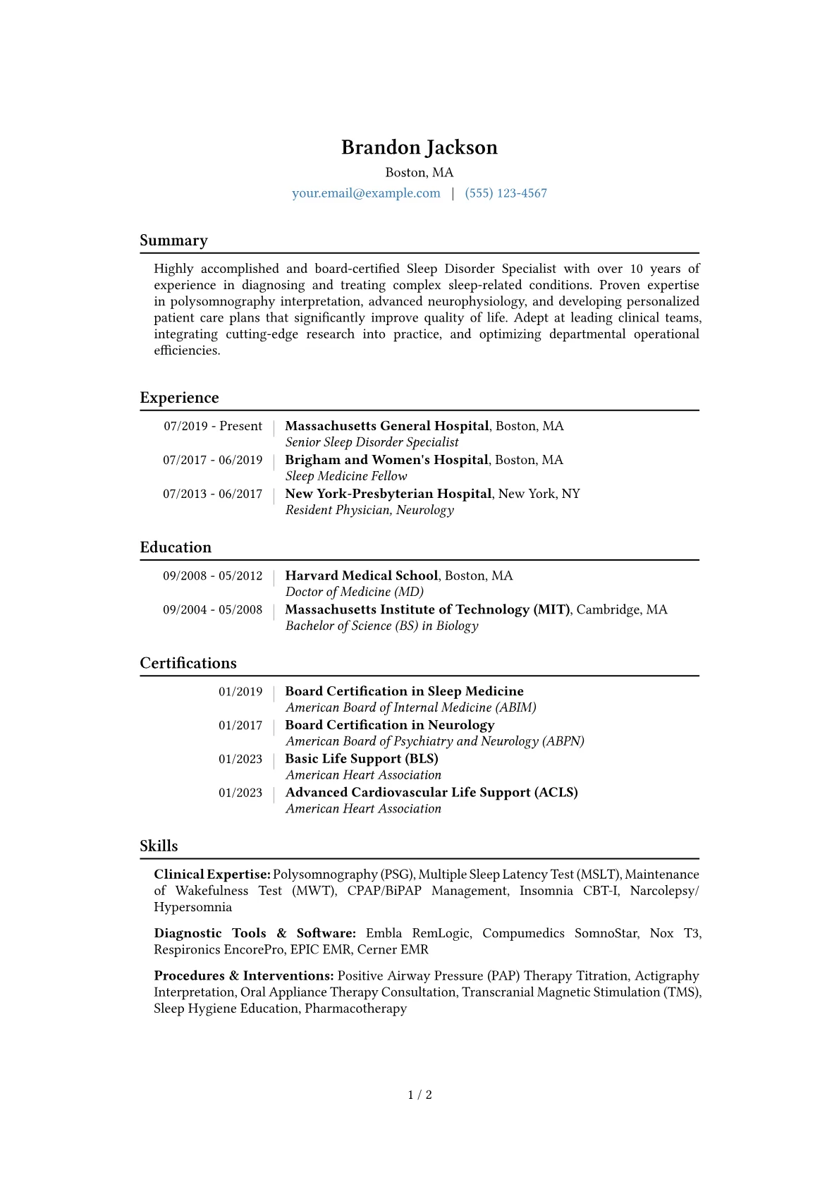 A compelling Sleep Disorder Specialist resume in Healthcare prioritizes demonstrated clinical expertise and patient-centered outcomes. Hiring managers seek detailed experience in conducting and interpreting polysomnography, titrating positive airway pressure therapies, and managing complex sleep disorders such as narcolepsy, insomnia, or restless legs syndrome. Key achievements should reflect improved diagnostic accuracy, enhanced patient adherence to treatment plans, and contributions to sleep lab efficiency, often expressed through metrics like reduced study turnaround times or increased patient satisfaction. Essential terminology includes AASM guidelines, sleep scoring proficiency, and familiarity with various diagnostic software platforms.
