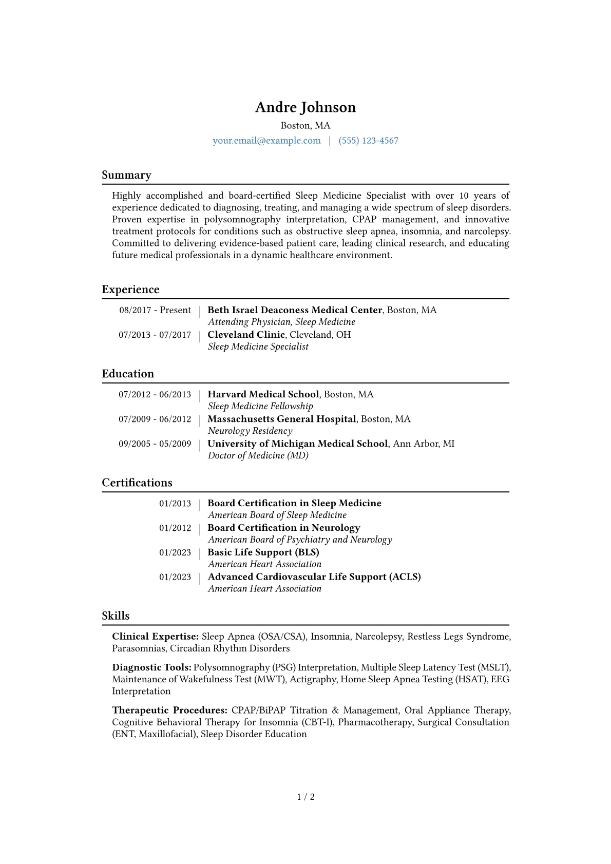 This example CV excels by clearly segmenting clinical proficiencies and operational contributions. It quantifies achievements effectively, such as "reduced misdiagnosis rates by 15% through enhanced diagnostic protocols" or "managed a patient panel of over 200 chronic insomnia cases." Skills are grouped logically under headings like "Diagnostic Interpretation," "Therapeutic Management," and "Patient Education," making expertise immediately apparent. Furthermore, specific technical tools and EMR systems used, alongside all relevant certifications, are highlighted prominently, assuring recruiters of the candidate's practical readiness and adherence to industry standards for a senior role.