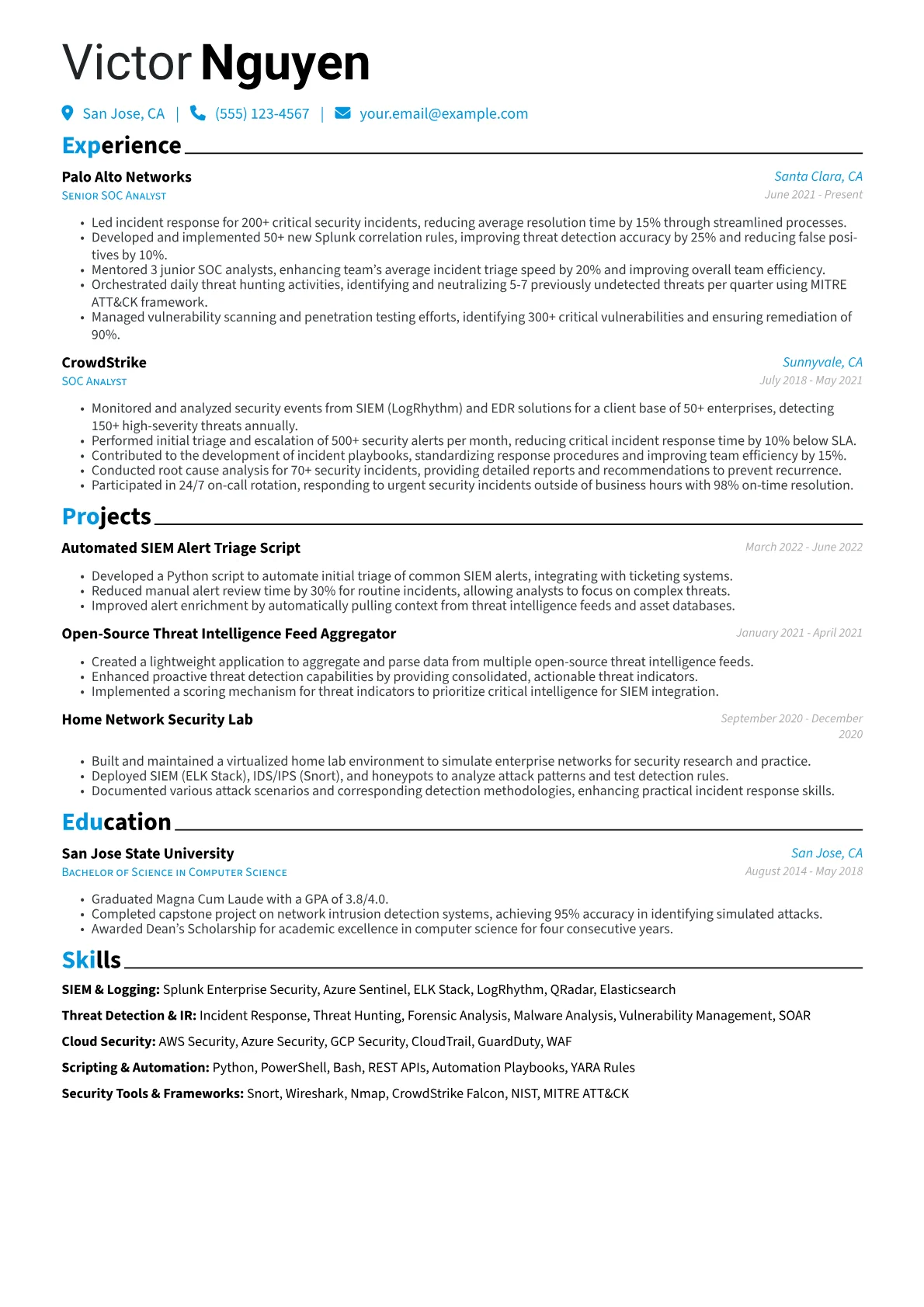 This example excels by incorporating quantifiable achievements that highlight direct impact on security operations, such as reducing incident response times. Its clear skills grouping immediately communicates proficiency in essential tools and methodologies, while prominently featuring relevant certifications like CompTIA Security+ validates core competencies crucial for the role. This structure clearly demonstrates the candidate's value.