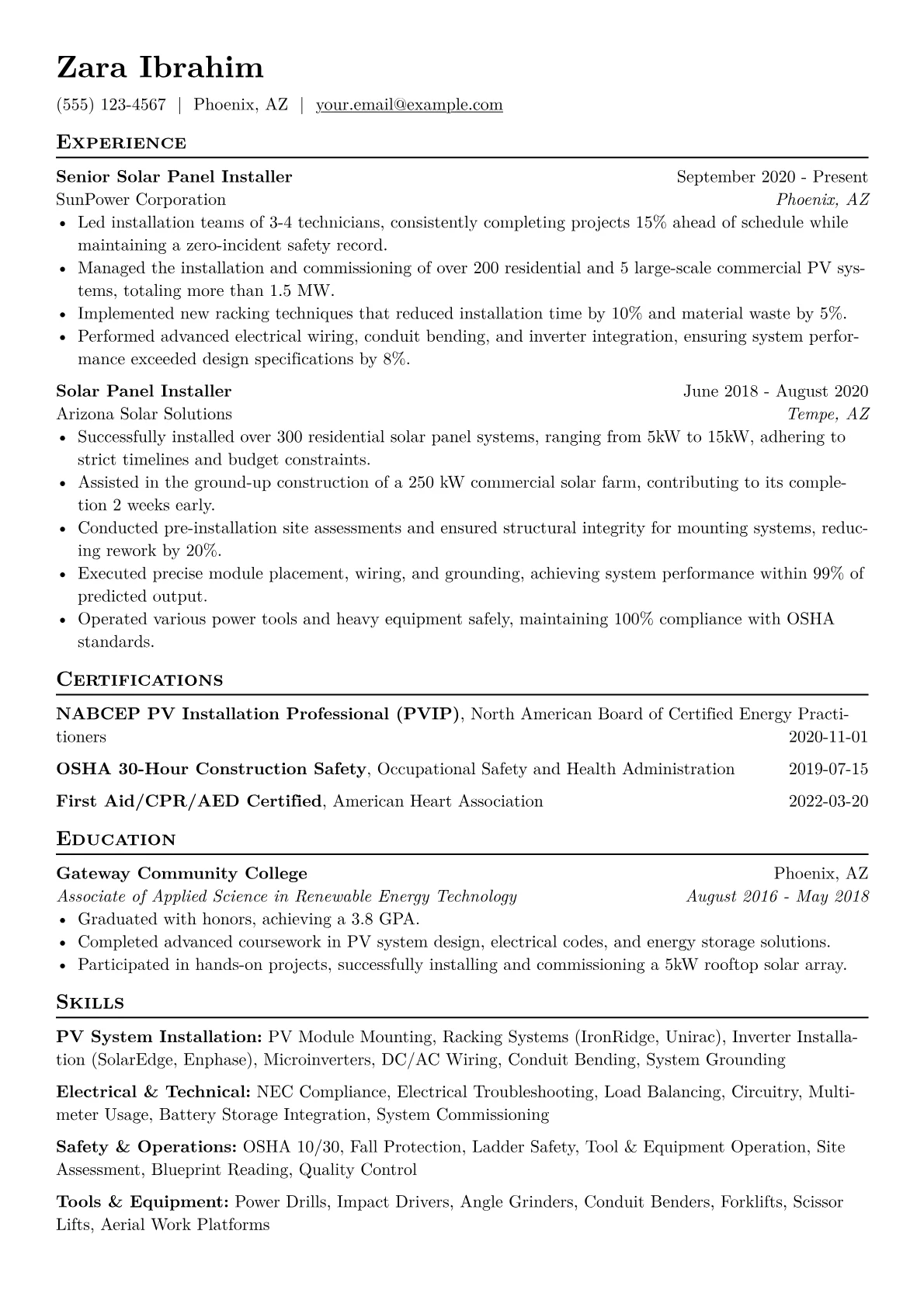 This example excels by incorporating quantifiable achievements, such as daily installation metrics and project completion rates, clearly demonstrating impact. It strategically groups essential skills like electrical wiring, mechanical assembly, and safety protocols, making qualifications instantly visible. Highlighting relevant certifications, like OSHA or NABCEP, further reinforces expertise and commitment to professional standards.