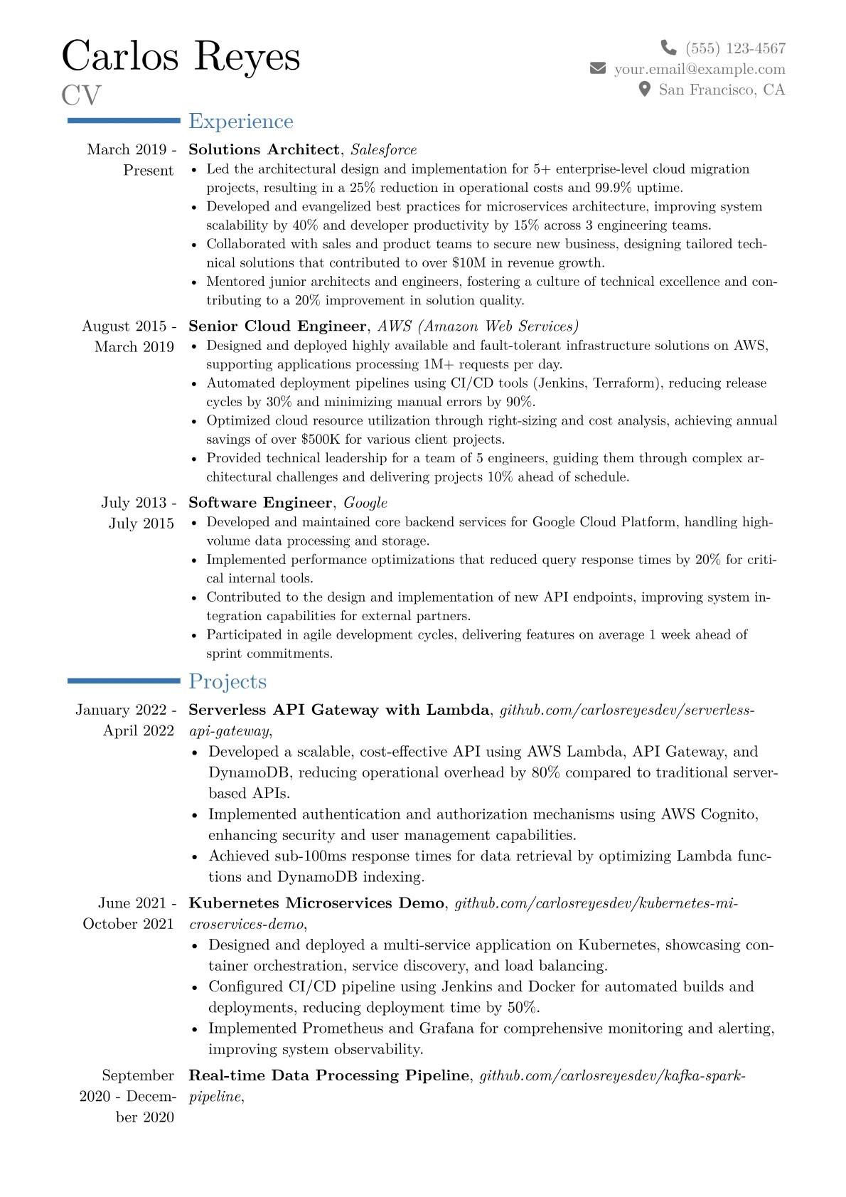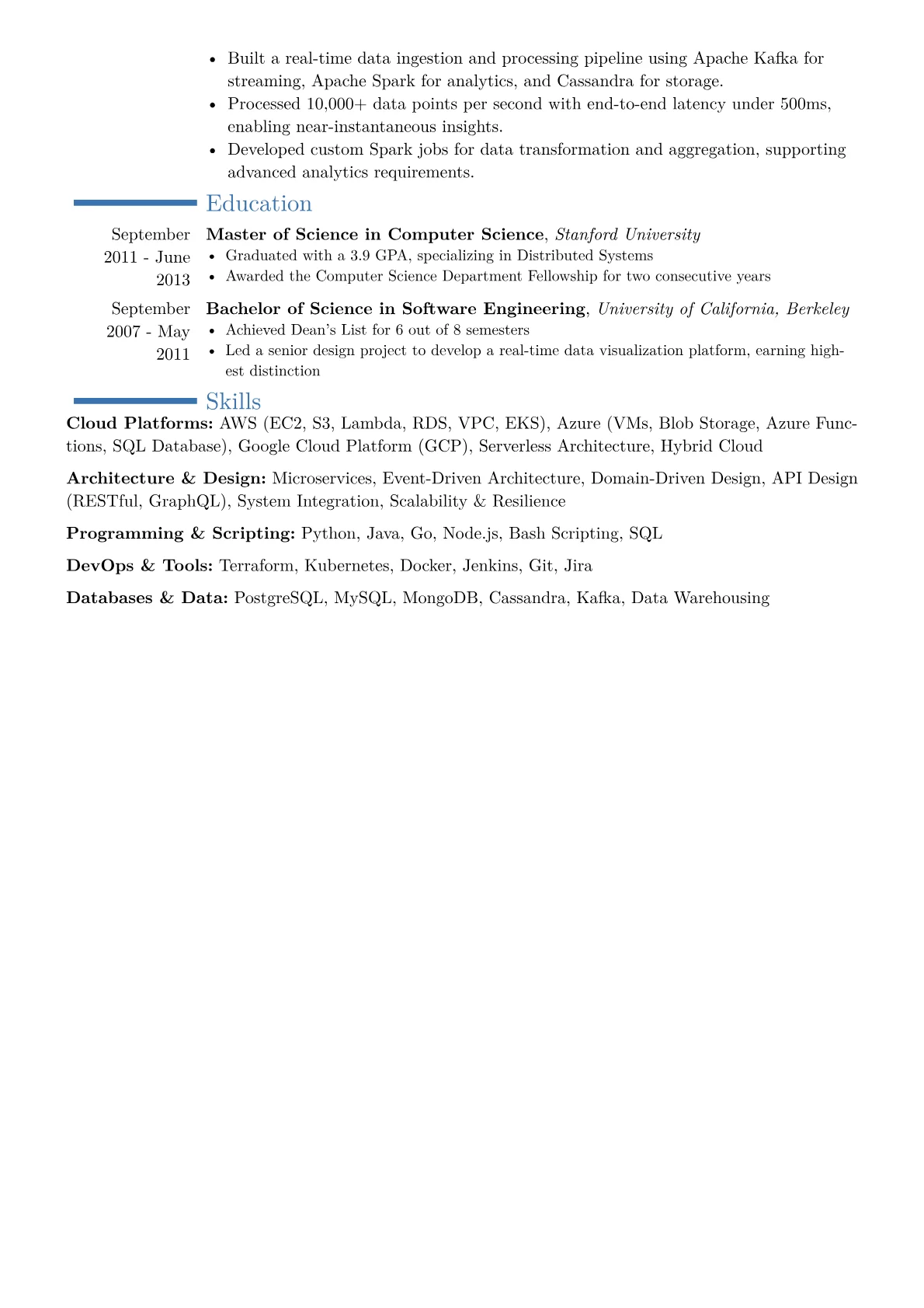 This example excels by clearly quantifying architectural achievements and their direct business outcomes, a crucial element for senior roles. Its structured skills grouping highlights essential technical stacks and relevant certifications, instantly communicating expertise and alignment with industry demands. The resume effectively demonstrates a solutions-oriented mindset through specific, impactful project descriptions.