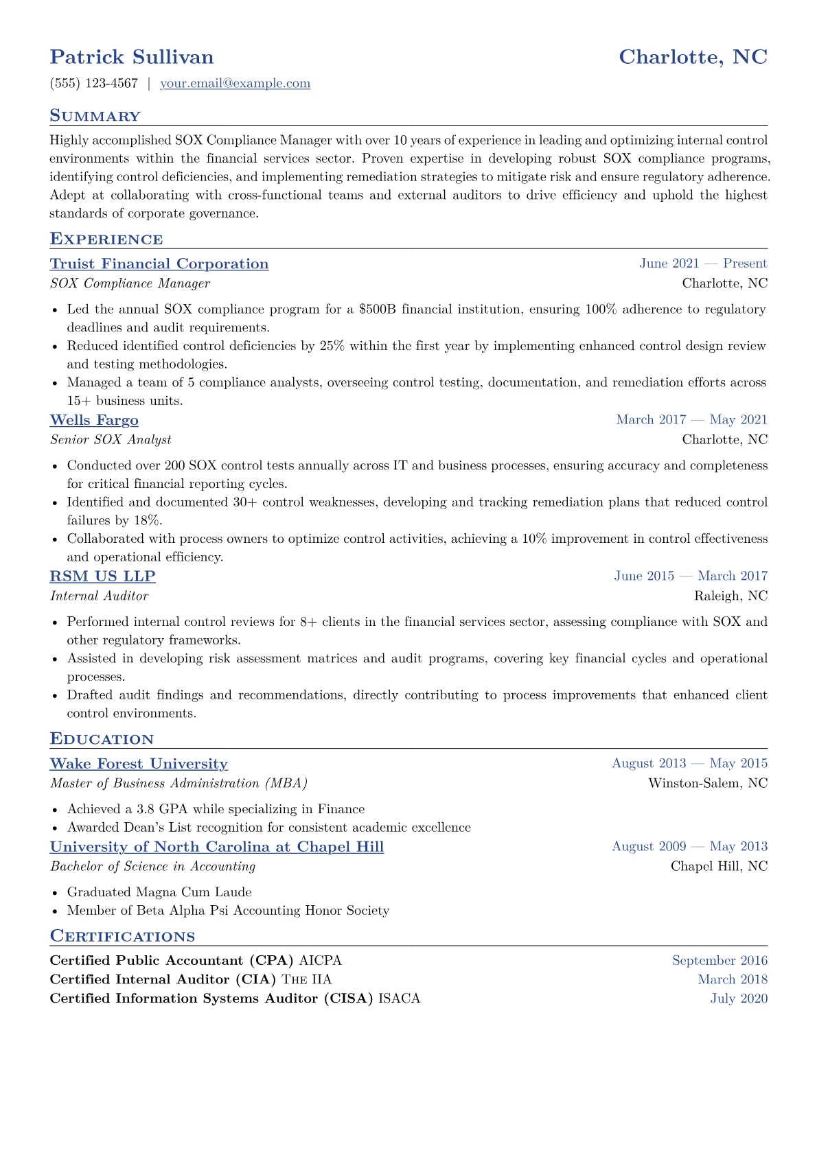This template was built with JobSprout and can be remixed to create your own tailored SOX Compliance Manager resume.
