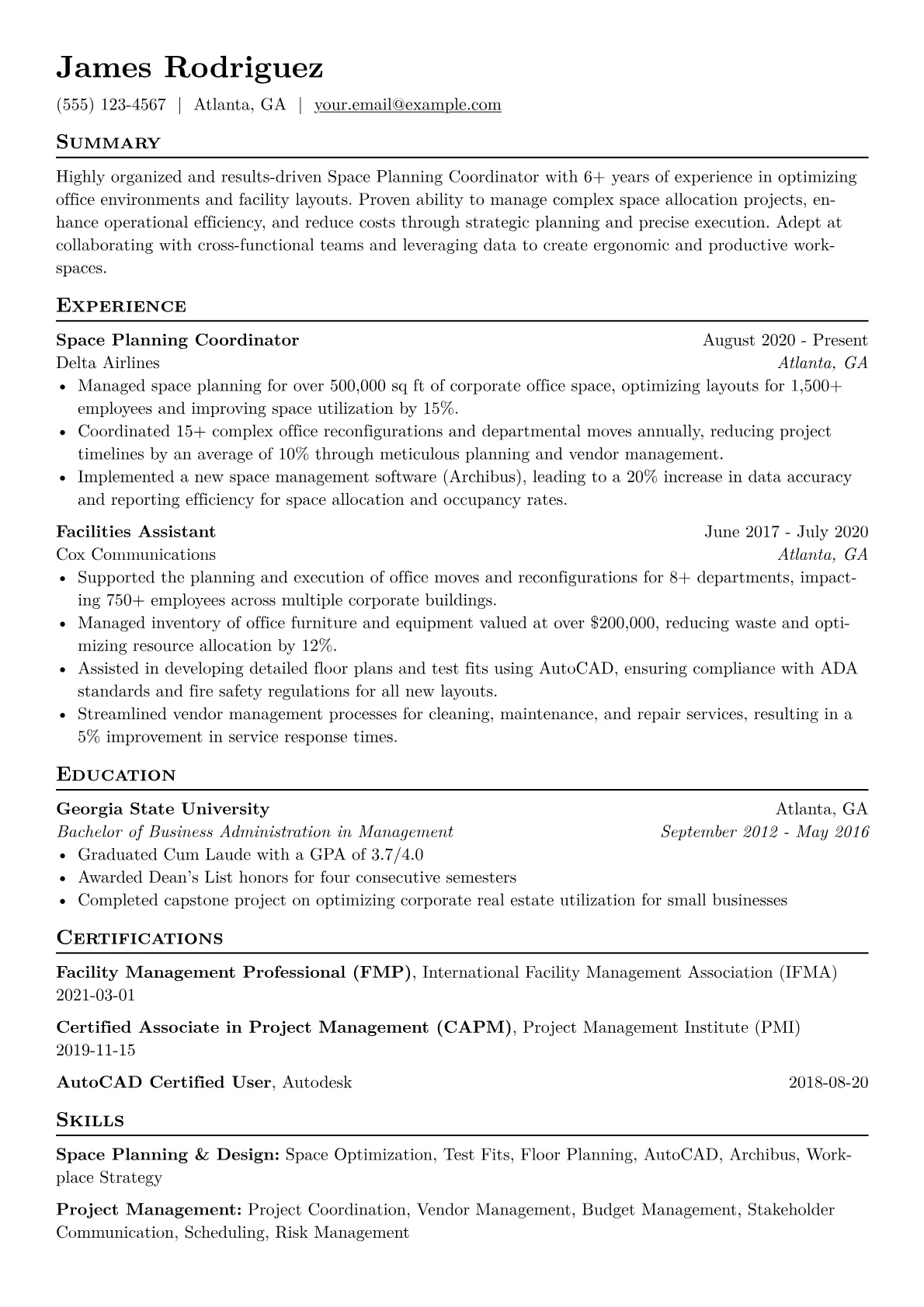 This exemplary template was built with JobSprout’s intuitive platform. It can be easily remixed to create your own tailored Space Planning Coordinator resume, perfectly suited to your experience and career goals.