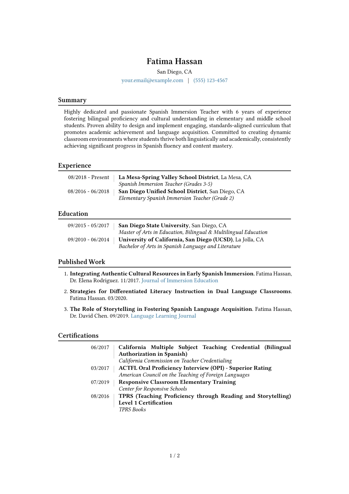 A compelling resume for a mid-level Spanish Immersion Teacher prioritizes demonstrable impact on student language acquisition and cultural competency. Hiring managers seek evidence of successful implementation of immersion methodologies, such as sustained target language use and alignment with ACTFL proficiency guidelines. Concrete achievements might include quantifiable increases in student biliteracy scores, innovative curriculum adaptations for diverse learners, or successful organization of cultural exchange programs. State teaching certifications with a bilingual or ESL endorsement are crucial, alongside proficiency in relevant educational technologies.