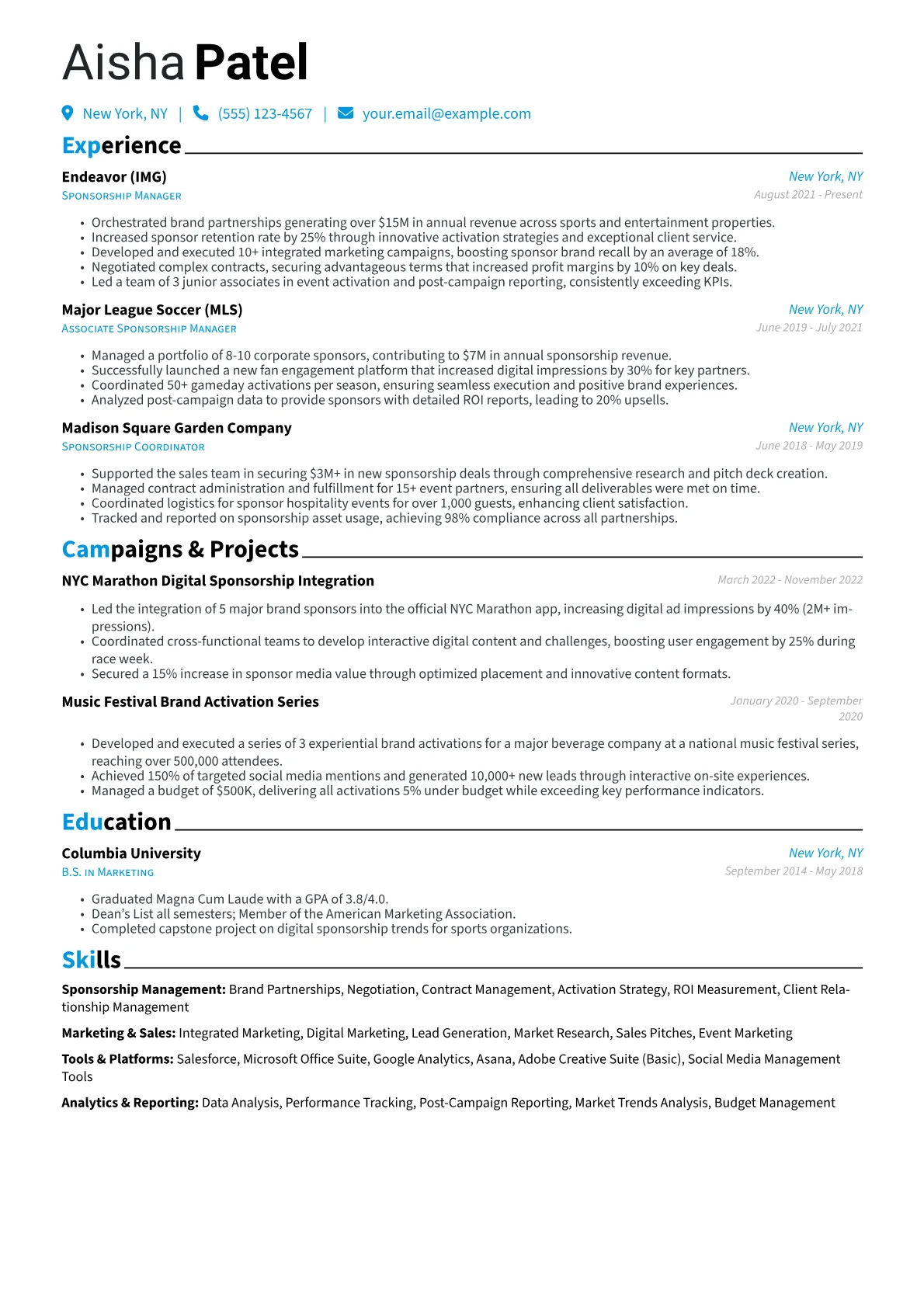 A strong Sponsorship Manager resume immediately showcases a candidate's ability to drive revenue and forge impactful partnerships. Hiring managers in Marketing & Advertising seek clear evidence of successful negotiation, contract management, and a deep understanding of brand alignment and ROI. The challenge is illustrating not just activity, but the tangible business outcomes from securing and nurturing sponsorships.