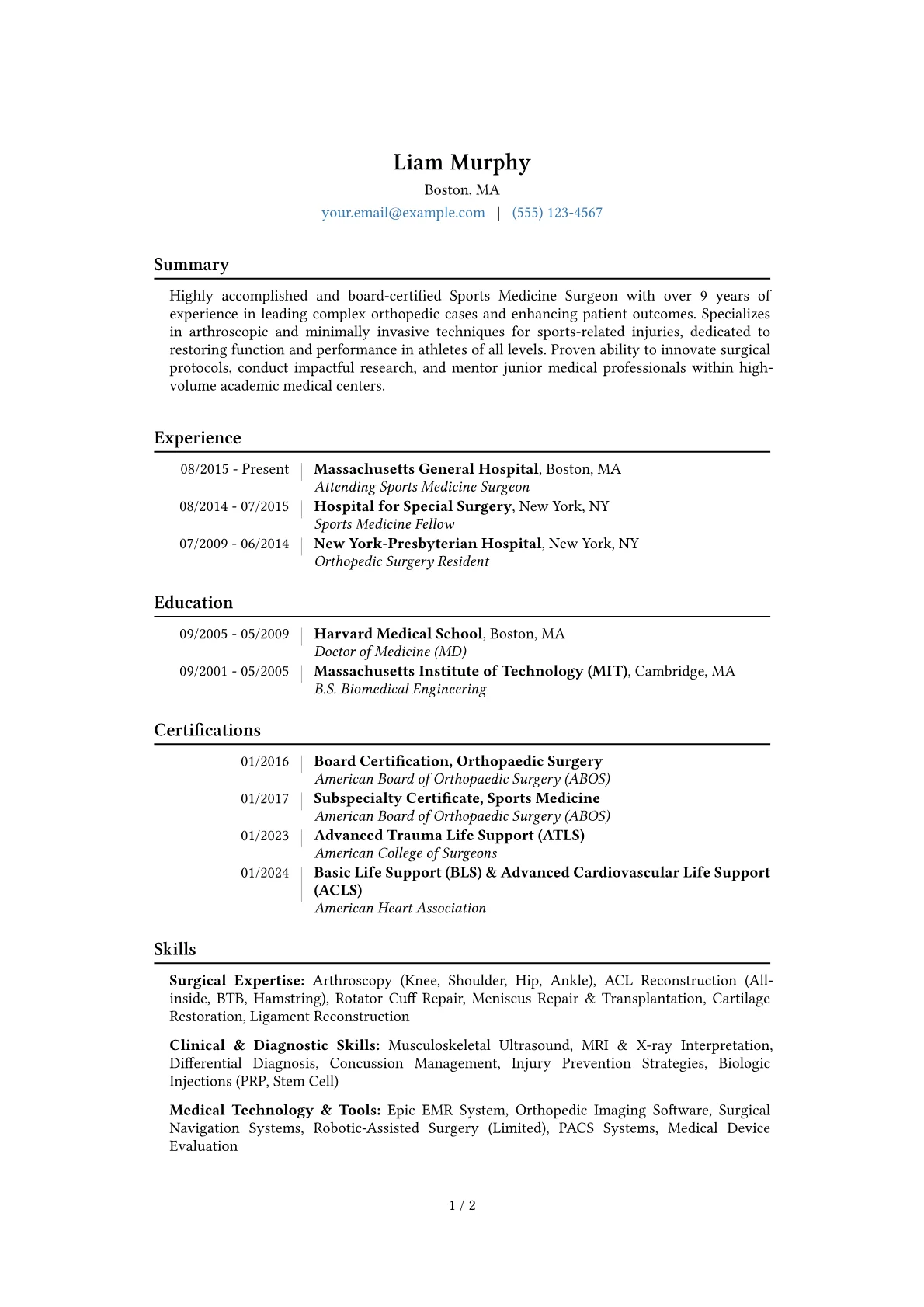 This example CV effectively highlights a Sports Medicine Surgeon's capabilities. Achievements are precisely quantified, for instance, detailing specific numbers of procedures performed annually or patient recovery success rates. Surgical expertise and clinical management skills are logically grouped, presenting a clear picture of diagnostic and treatment capabilities, including non-operative care and rehabilitation protocols. Critical certifications, such as ABOS Board Certification in Sports Medicine, are given immediate visibility, alongside proficiency in relevant EMR systems and cutting-edge surgical technologies.