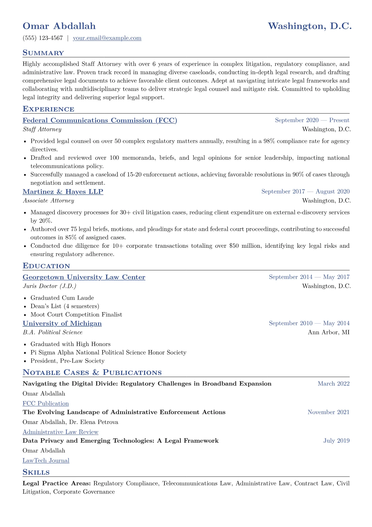 A strong Staff Attorney resume for a mid-level professional (3-7 years experience) must prominently feature precise legal drafting skills, detailed case management, and successful regulatory navigation. Hiring managers look for concrete achievements such as successful internal advisory, impactful litigation support, or effective contract negotiation outcomes. Specifics like managing discovery for complex cases, drafting detailed legal opinions, or ensuring adherence to specific industry regulations (e.g., data privacy, financial compliance) resonate deeply. State Bar admission and proficiency in tools like Westlaw, LexisNexis, or specific e-discovery platforms are expected foundations.