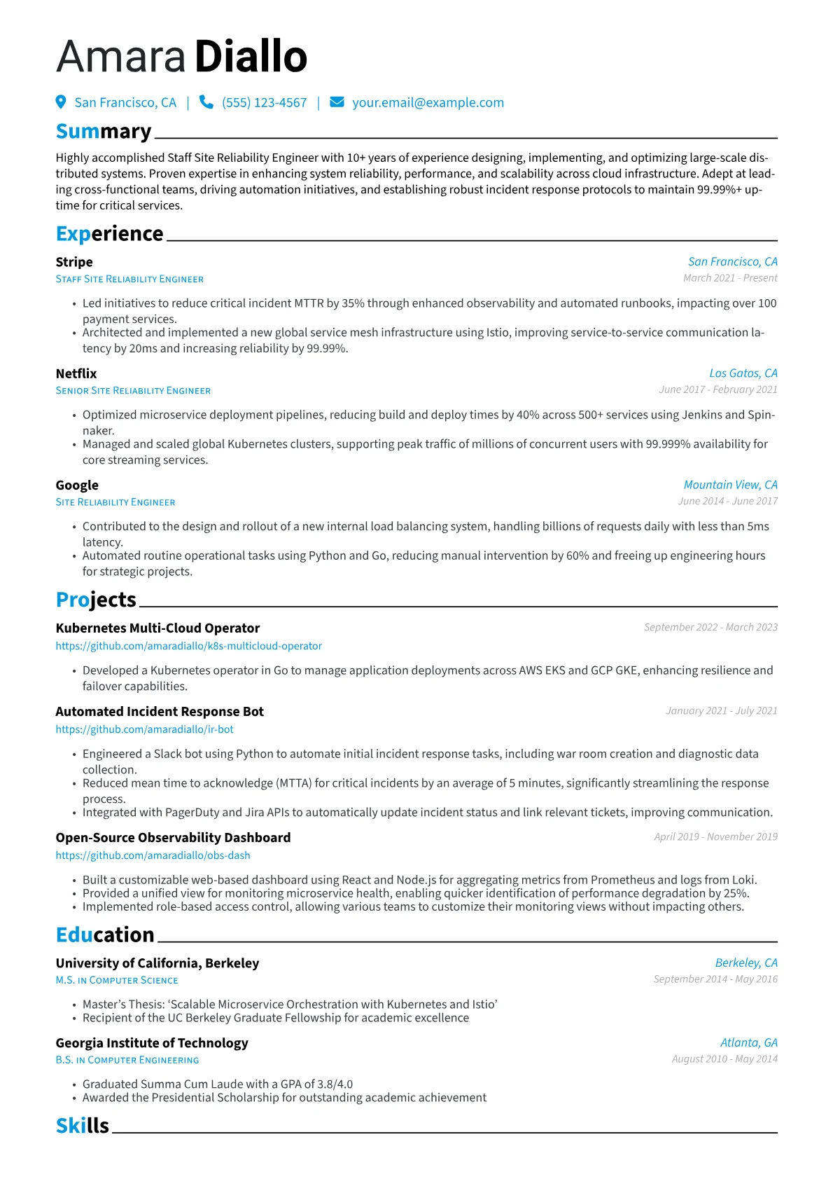 This sophisticated template was expertly built using JobSprout. It offers a robust framework readily remixed to create a personalized Staff Site Reliability Engineer resume.