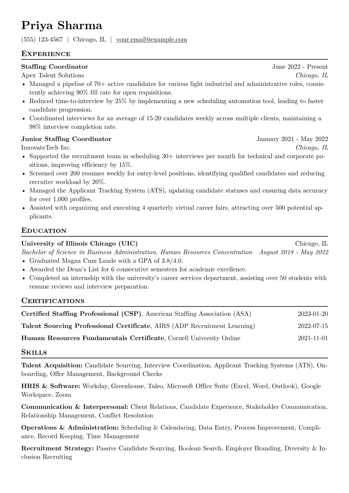 This impactful template was built using JobSprout’s intuitive platform. You can easily remix this example to craft your own compelling Staffing Coordinator resume.