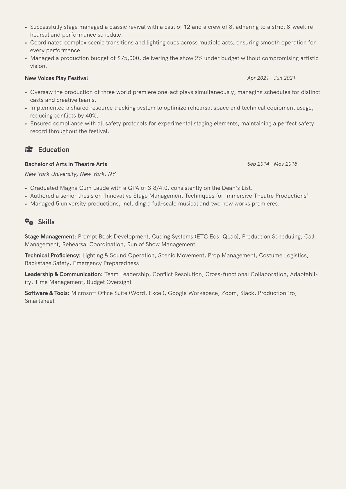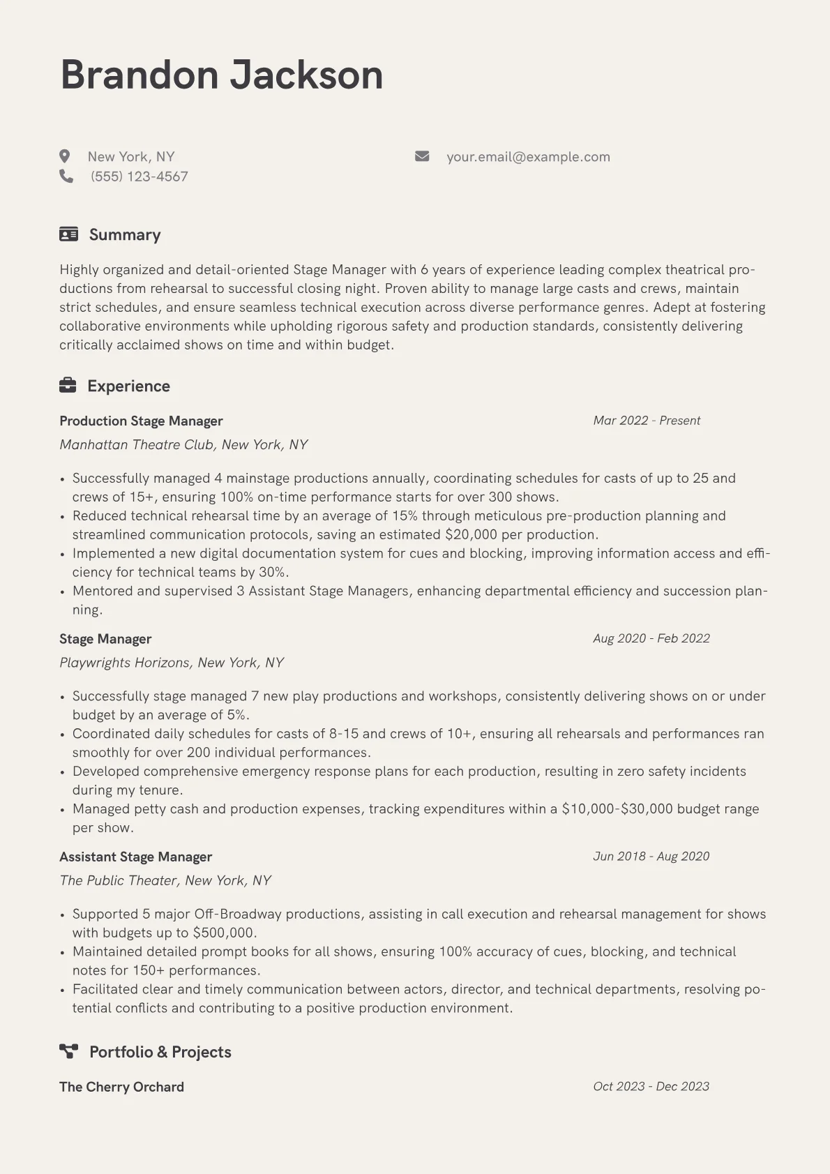 This template was built with JobSprout and can be remixed to create your own tailored Stage Manager resume, ensuring all critical aspects of your experience are well-represented.