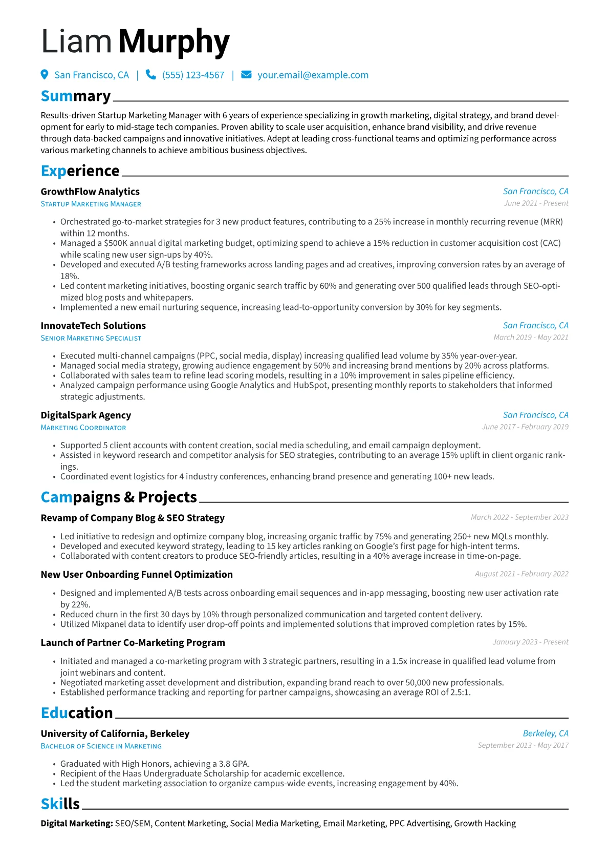 This template was built with JobSprout and can be remixed to create your own tailored Startup Marketing Manager resume.