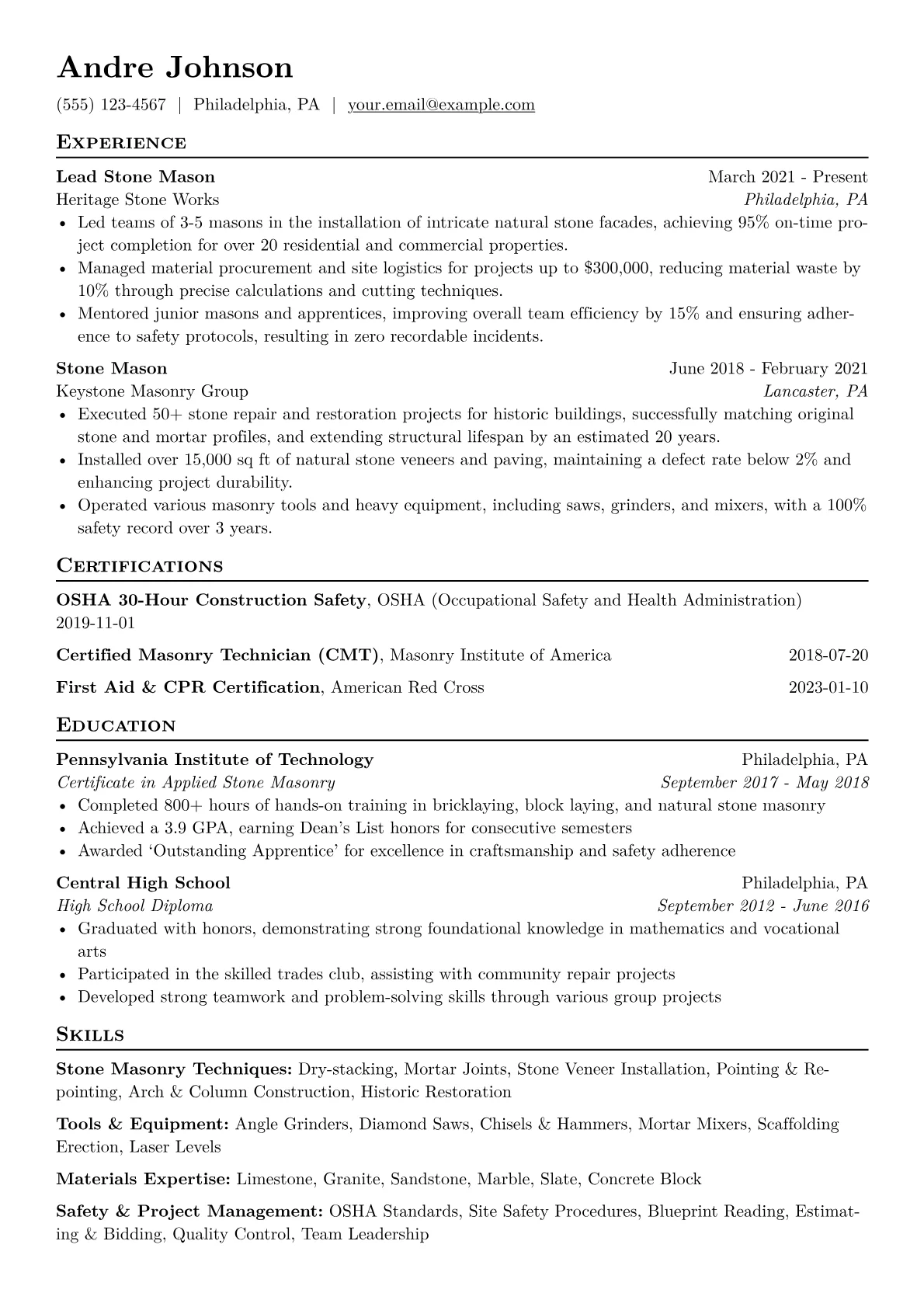 A strong Stone Mason resume effectively showcases precision craftsmanship, safety adherence, and material expertise. Manufacturing hiring managers prioritize candidates who demonstrate a proven track record in complex projects, efficient material usage, and strict compliance with safety regulations like OSHA. The unique challenge lies in translating hands-on skill and artistic vision into compelling, quantifiable resume bullet points.