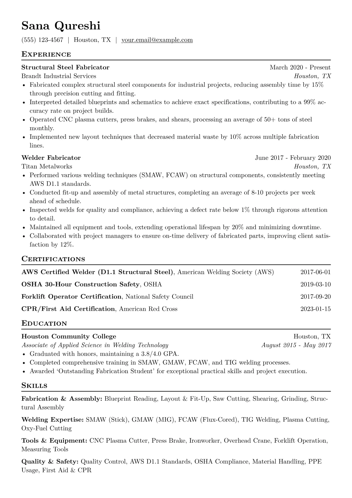 This example resume effectively showcases these crucial elements through its clear organization. It groups essential skills like various welding techniques and equipment operation, while also quantifying achievements to illustrate successful project completion and efficiency. Including relevant certifications like AWS or OSHA further reinforces the candidate’s qualifications and commitment to industry best practices.