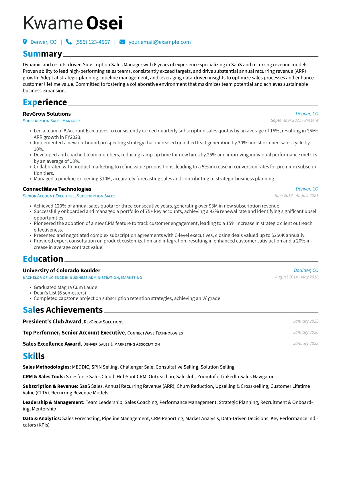 This template, expertly built using JobSprout, provides an excellent foundation and can be easily remixed to craft your own tailored Subscription Sales Manager resume.