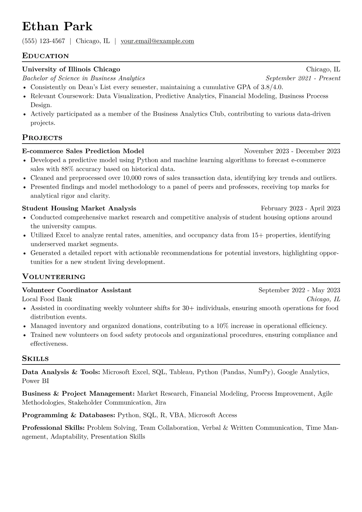 This resume example excels by strategically grouping relevant skills and highlighting quantifiable achievements from academic projects, volunteer roles, and personal endeavors. Such clear, data-driven points demonstrate a tangible impact and an organized approach to skill presentation, which is crucial for entry-level positions.