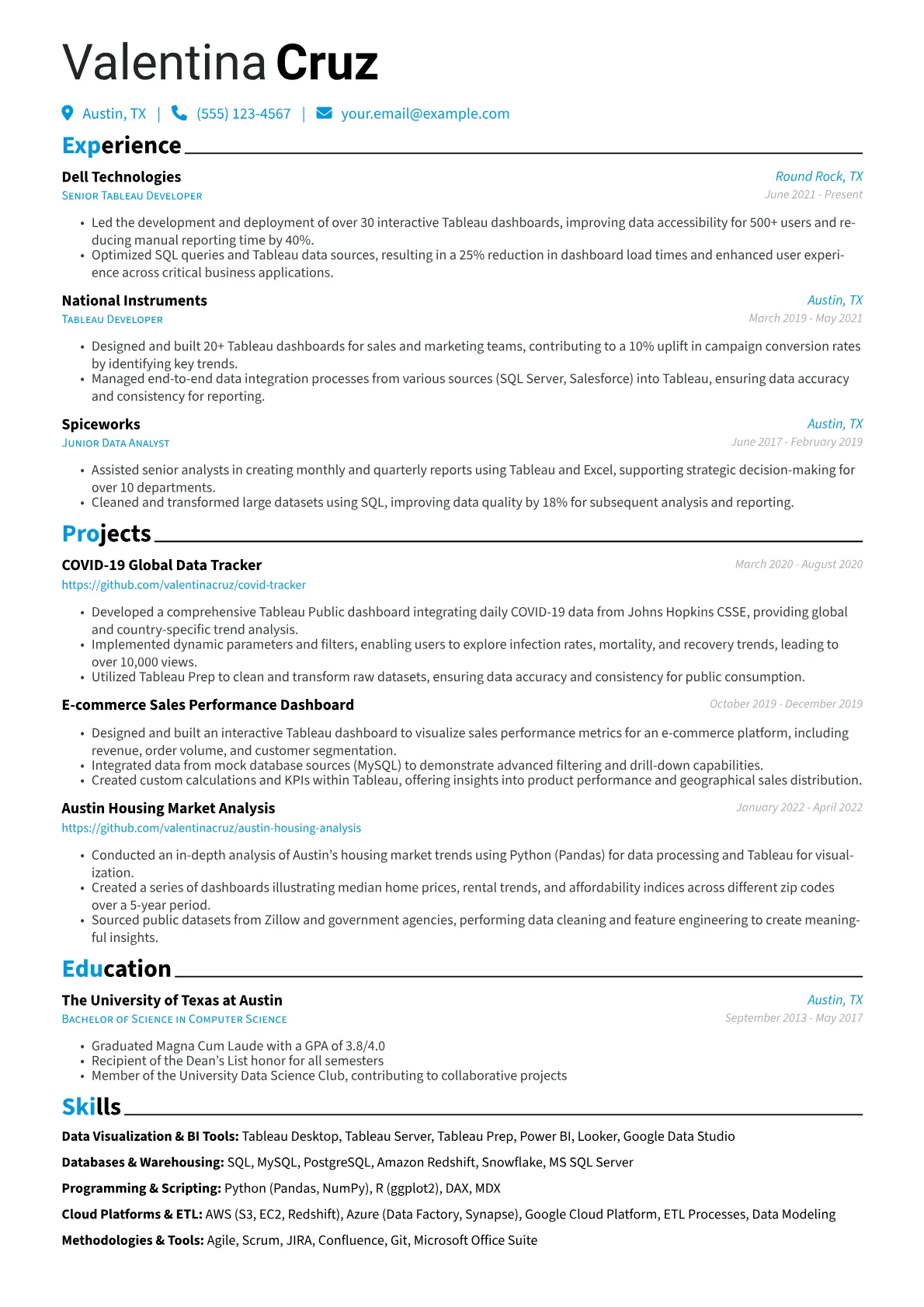 This Tableau Developer example excels by integrating quantified achievements directly within each role description, clearly illustrating tangible value delivered. Its strategic skills grouping highlights key areas like data modeling, dashboard design, and ETL processes, while prominent display of relevant certifications reinforces expertise. This structure allows recruiters to quickly grasp the candidate's technical depth and business acumen.