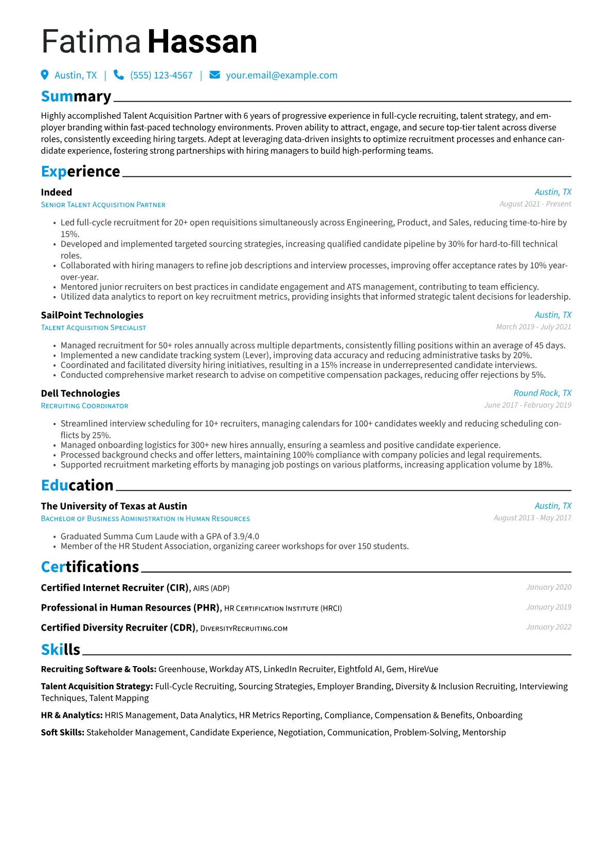 The example CV excels by structuring information to highlight these critical competencies. Achievements are precisely quantified, detailing successes like "reduced average time-to-fill by 18% across 40+ unique roles" and "exceeded quarterly hiring targets by 12% for critical positions." Skills are thoughtfully grouped into categories such as "ATS & CRM Proficiency (Lever, SAP SuccessFactors)," "Sourcing & Engagement Strategies (Boolean Search, LinkedIn Recruiter)," and "HR & Talent Strategy (DE&I Initiatives, Employer Branding)." Certifications like Certified Internet Recruiter are prominently listed, alongside specific recruitment tools.