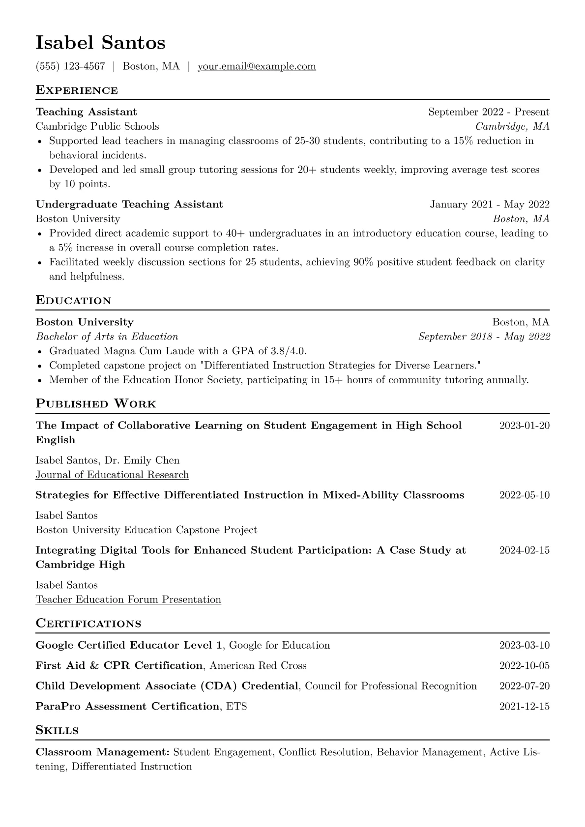 A compelling Teaching Assistant resume effectively showcases an applicant's ability to support educators and foster student learning. Hiring managers in education seek candidates demonstrating strong communication, organizational skills, and a genuine passion for guiding students. The unique challenges of this role often include adapting to diverse learning needs, assisting with classroom management, and seamlessly integrating into existing educational frameworks.