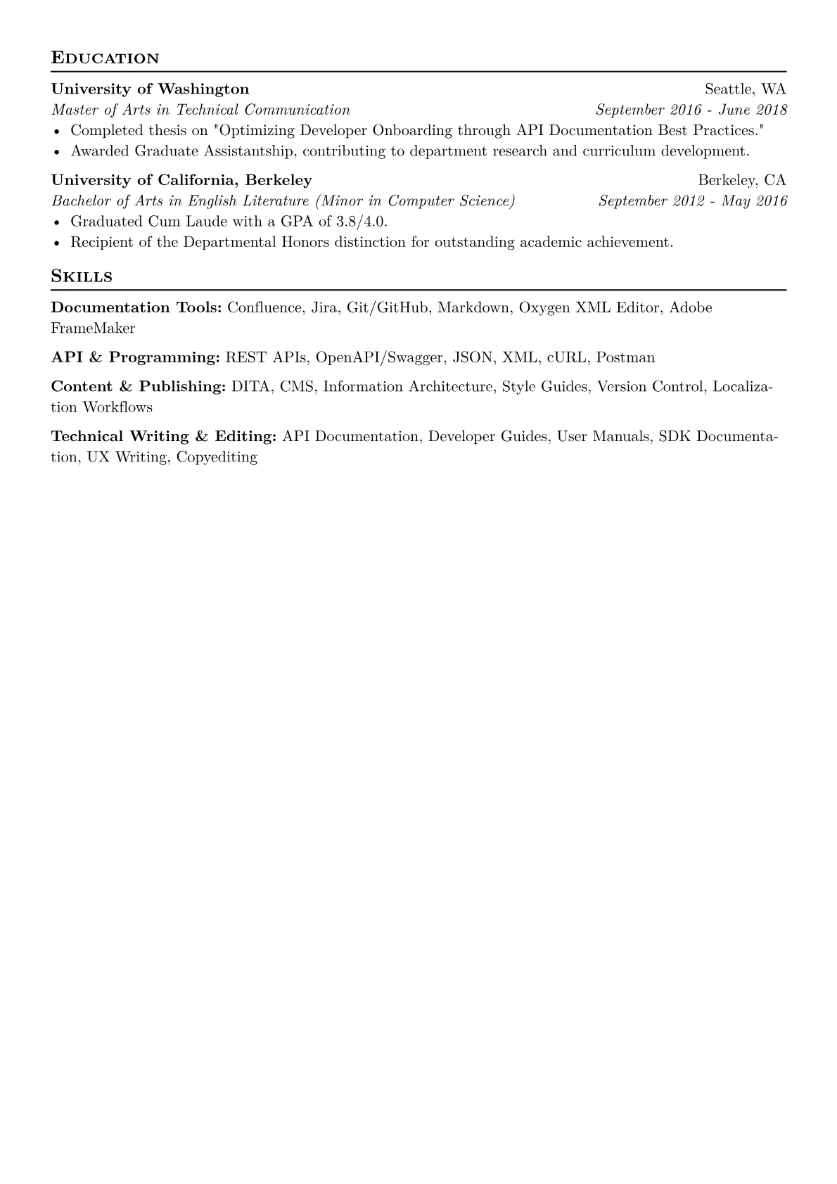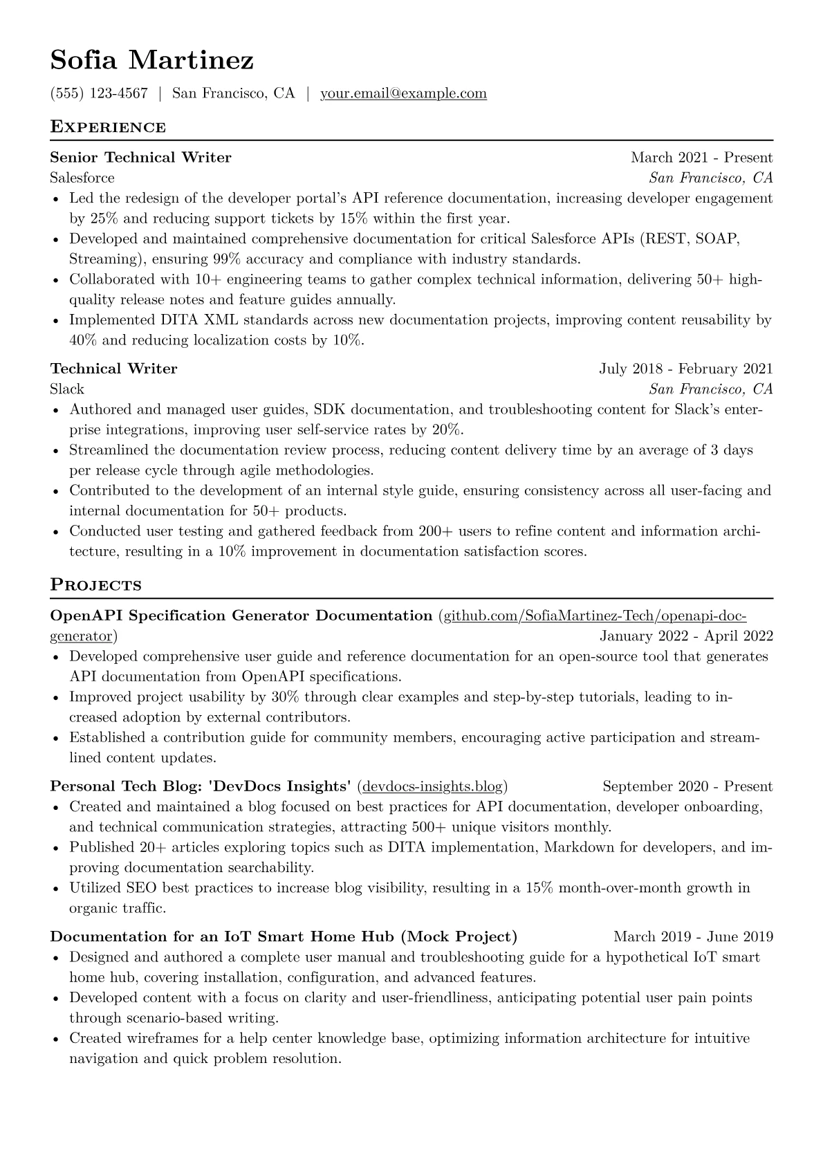 This example resume excels by highlighting specific achievements with quantifiable metrics, such as improving user onboarding or reducing support inquiries. It thoughtfully groups skills relevant to the tech sector, including proficiency in documentation tools, content management systems, and understanding of API documentation. Clear project descriptions further illustrate the writer's talent for simplifying intricate technical details for diverse audiences.
