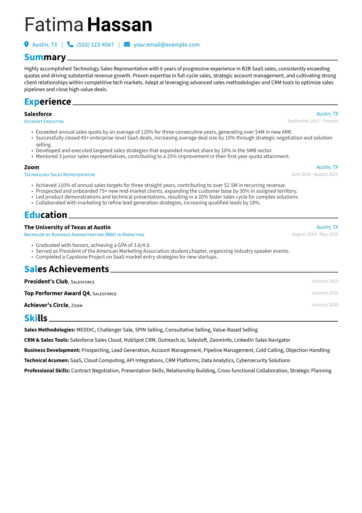 This example resume effectively highlights these critical areas. Achievements are quantified, detailing percentages over quota and direct revenue contributions. Skills are thoughtfully grouped, separating CRM proficiency (e.g., Salesforce, HubSpot) from sales methodologies and technical product knowledge relevant to the technology sector. Key certifications, like a Salesforce Administrator or specific product training, are prominently featured, immediately signaling a candidate’s practical capabilities and commitment to best practices in technology sales.
