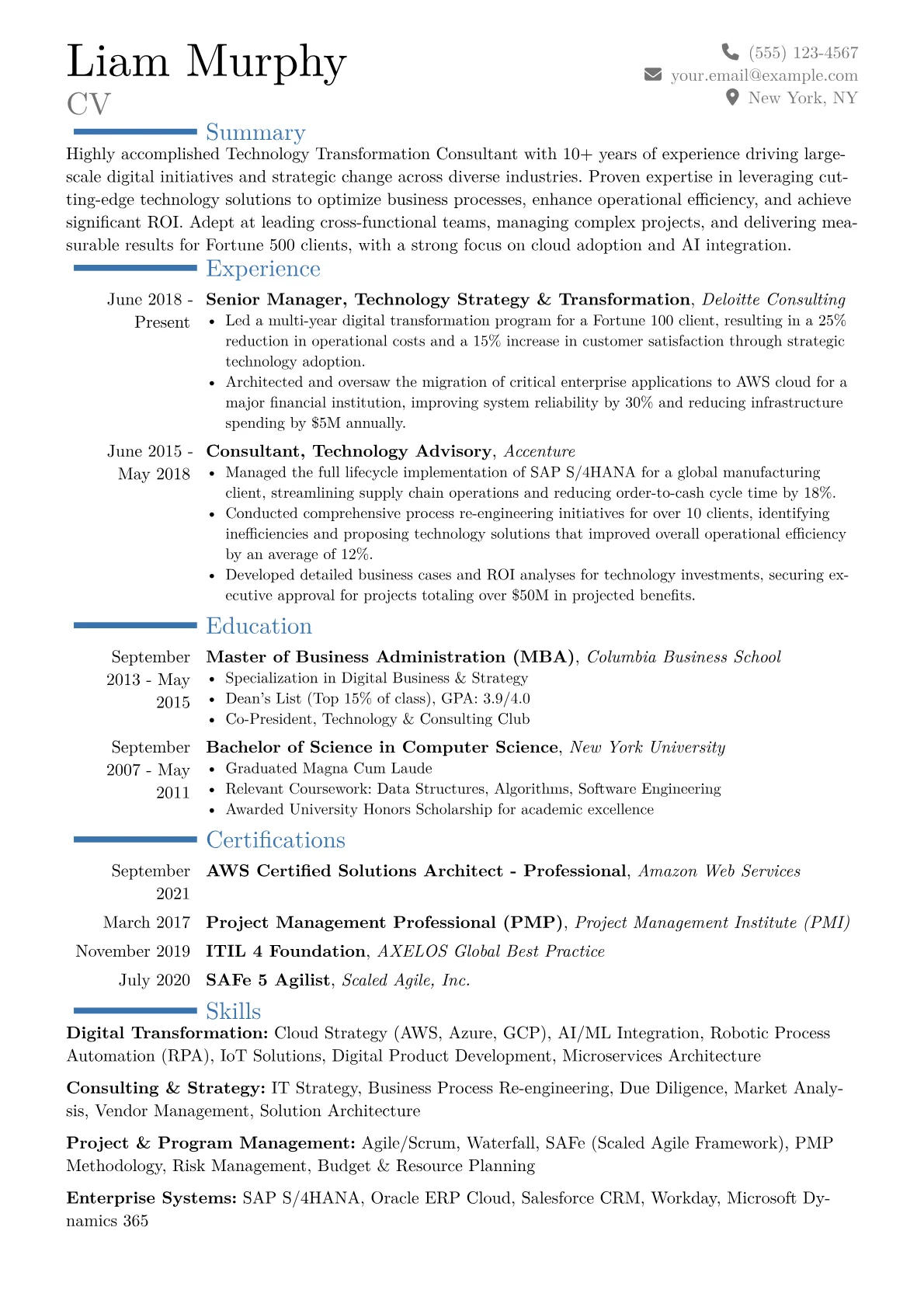 The JobSprout example resume effectively structures these critical elements. It quantifies achievements using precise metrics, such as "optimized supply chain processes, leading to a 15% reduction in logistics overhead." Skills are logically grouped, separating technical proficiencies like "Cloud Platforms: AWS, Azure, GCP" from "Consulting Methodologies: Agile, Waterfall, Lean." Crucially, specific tools and certifications relevant to a Technology Transformation Consultant, such as "SAP S/4HANA implementation" or "ITIL v4 certification," are prominently featured, often in dedicated sections or within experience descriptions, ensuring quick identification by recruiters.