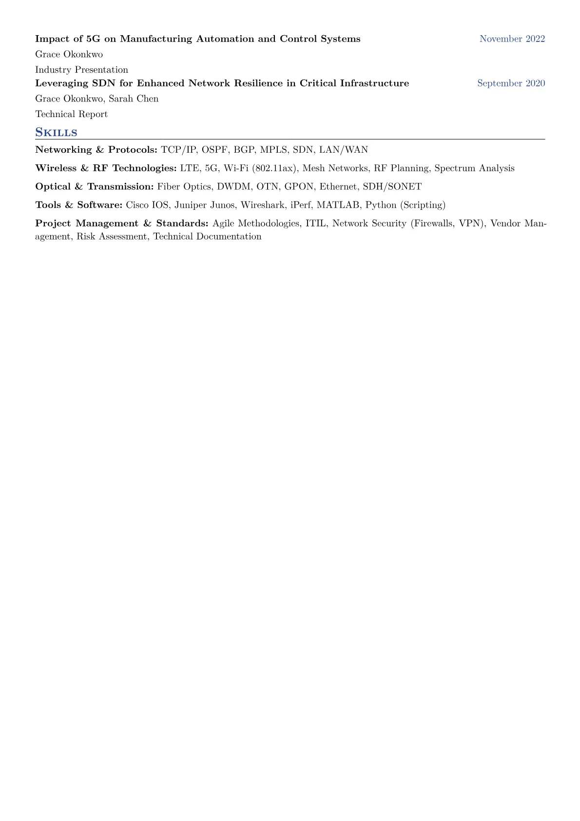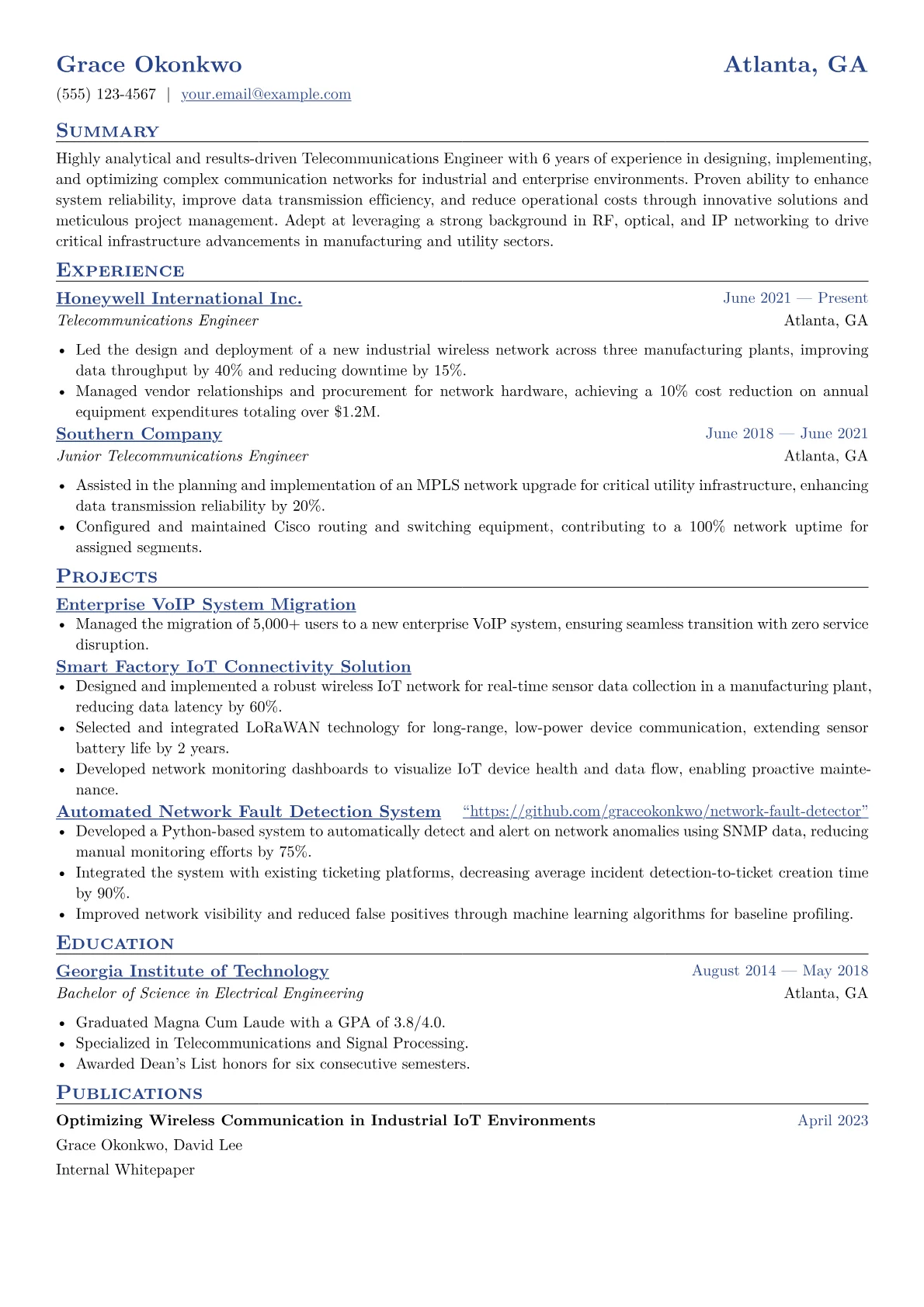 The JobSprout Telecommunications Engineer example effectively showcases these critical elements. It thoughtfully groups skills, distinguishing between network protocols, hardware management, and industrial automation software. Achievements are precisely quantified, such as "Reduced network latency by 20% across four production facilities," or "Successfully deployed wireless mesh networks supporting 300+ IIoT devices." Crucially, specific tools like Siemens TIA Portal, Wireshark, and fiber optic test equipment are highlighted, alongside relevant certifications, immediately signaling a candidate’s practical capabilities.