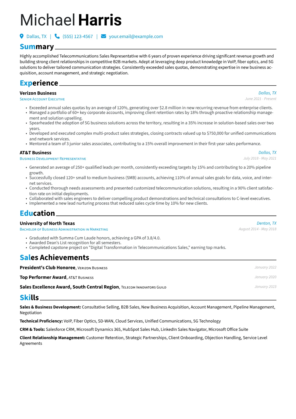 This template was built with JobSprout and can be remixed to create your own tailored Telecommunications Sales Representative resume.