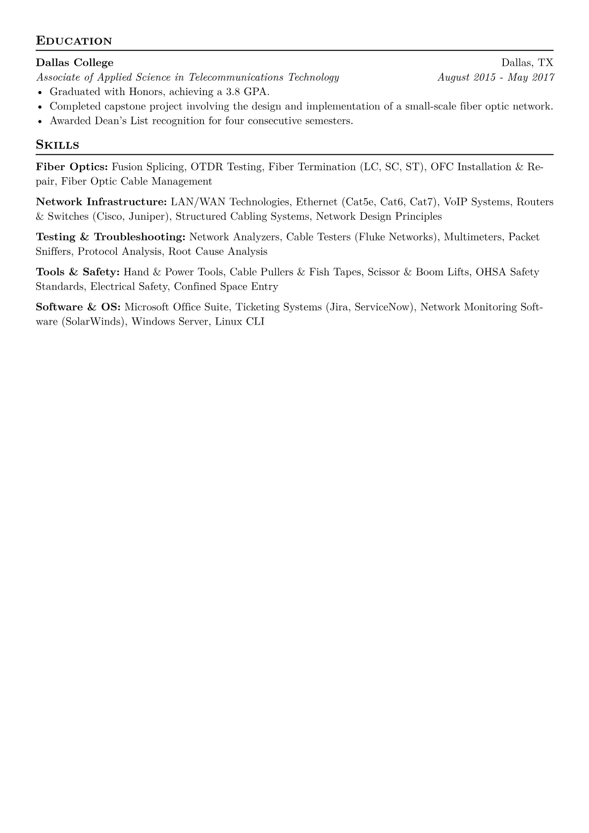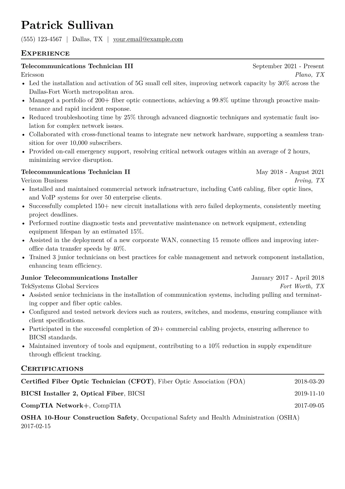 This example excels by immediately highlighting quantified achievements, such as specific reductions in network latency or improved system reliability. Its clear skills grouping separates core technical competencies like fiber optics and IP networking from essential soft skills, while prominently featuring relevant industry certifications demonstrates a commitment to professional development. This targeted approach efficiently communicates value to prospective employers.