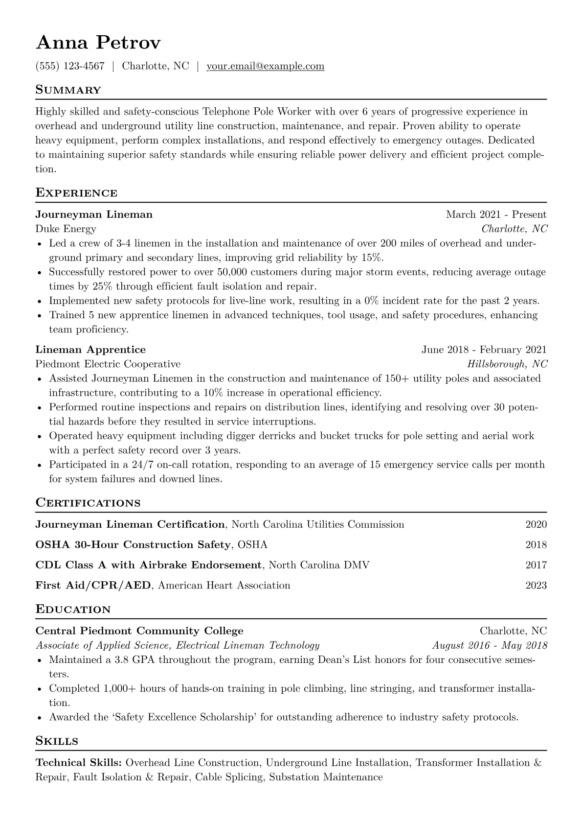 A compelling resume for a Telephone Pole Worker in Manufacturing must immediately convey robust practical experience and an unwavering commitment to safety. Hiring managers seek evidence of successful line installation, maintenance, and repair, often requiring work at height and in varying conditions. Specific achievements should include maintaining grid uptime, resolving outages efficiently, and demonstrating proficiency with pole climbing, conductor stringing, and transformer replacement. Crucial certifications such as a Class A CDL, OSHA 10/30, and First Aid/CPR, alongside adherence to NESC guidelines, are expected.