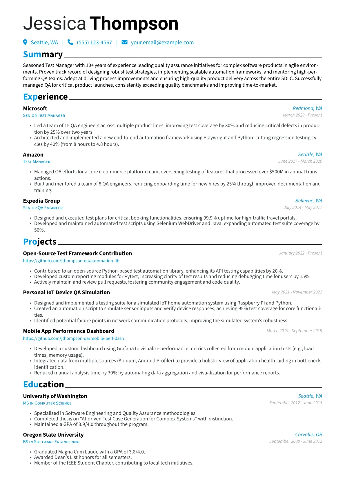 For senior Test Managers in the technology industry, hiring managers seek more than just team leadership. They look for demonstrated ownership of quality engineering initiatives, focusing on strategic impact across the SDLC. Key achievements include improving automation frameworks, reducing defect leakage rates, optimizing test cycle times, and implementing robust performance or security testing strategies. Concrete experience with CI/CD integration, cloud-native testing environments, and advanced certifications like ISTQB Advanced Test Manager or specific cloud accreditations (e.g., AWS, Azure) are highly valued indicators of expertise and forward-thinking leadership in a complex software engineering landscape.