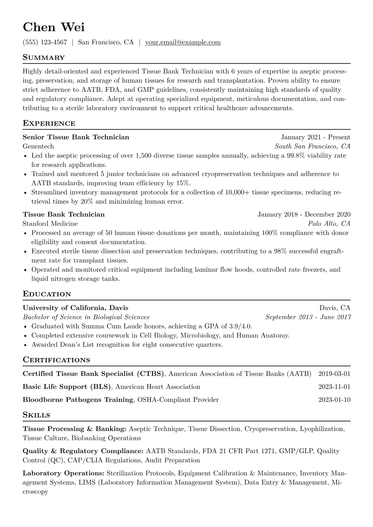 This example resume effectively showcases these vital attributes through its structured presentation. Achievements are clearly quantified, for instance, detailing the volume of samples processed daily or the successful implementation of new tissue preparation techniques that reduced contamination rates. The skills section thoughtfully groups technical proficiencies like tissue embedding, microtomy, and nucleic acid extraction, separate from compliance knowledge such as FDA 21 CFR Part 1271. It prominently highlights relevant certifications, including specific CTBS credentials, and lists proficiency with specialized equipment like automated tissue processors and inventory management software, demonstrating immediate value to potential employers.