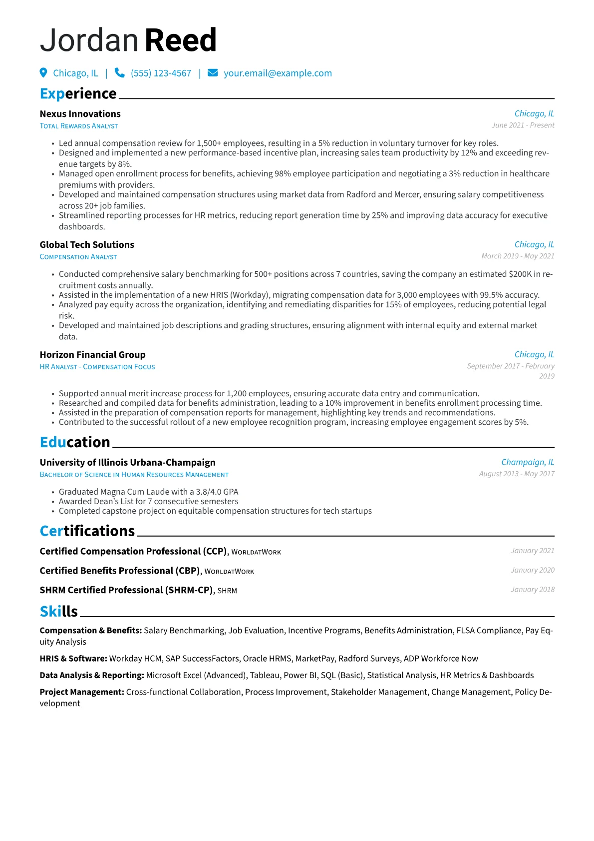 This JobSprout example effectively showcases these crucial skills through its structure. It highlights quantified achievements, such as specific cost savings or program improvements, immediately demonstrating impact. The resume also features a clear grouping of relevant technical skills like HRIS platforms, market pricing tools, and data analytics, alongside any pertinent certifications like CCP or CBP, which are highly valued credentials.