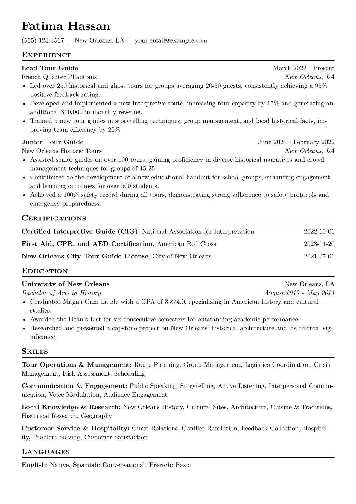 This example effectively addresses these needs by featuring quantified achievements, such as "led daily historical tours for 30+ visitors." It strategically groups key skills like "Public Speaking & Engagement" and "Problem Solving & Adaptability" to highlight essential tour guide competencies. Including relevant certifications, like First Aid or local history courses, further enhances credibility and demonstrates commitment.