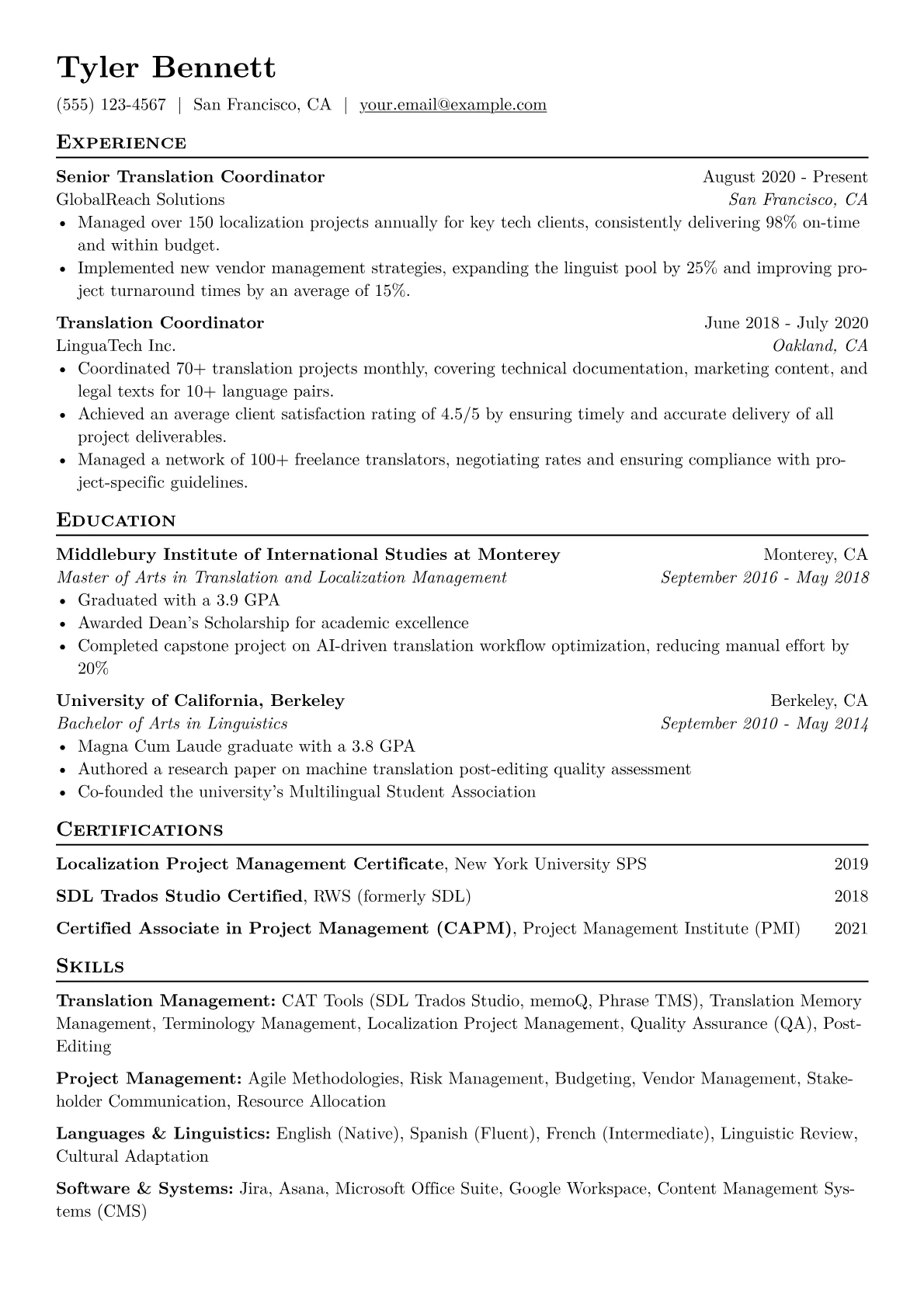 This JobSprout example effectively showcases these qualities through its structure. It employs quantifiable achievements, such as specific project volumes and efficiency improvements, to demonstrate impact. The resume also effectively groups relevant technical skills, like CAT tool proficiency and TMS experience, alongside crucial soft skills such as stakeholder communication and problem-solving, providing a holistic view of the candidate's capabilities.